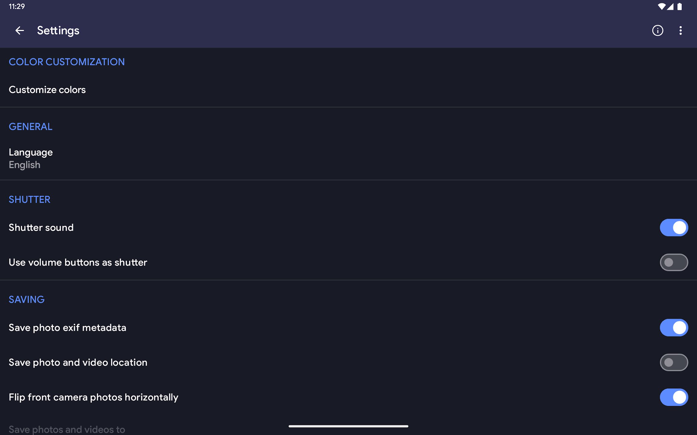 - 🖼️ МАТЕРИАЛЬНЫЙ ДИЗАЙН: Наслаждайтесь элегантным, удобным интерфейсом с материальным дизайном и динамичной темой, которая адаптируется к вашим предпочтениям. Независимо от того, используете ли вы приложение днем или ночью, Fossify Camera обеспечивает плавную и интуитивно понятную работу.