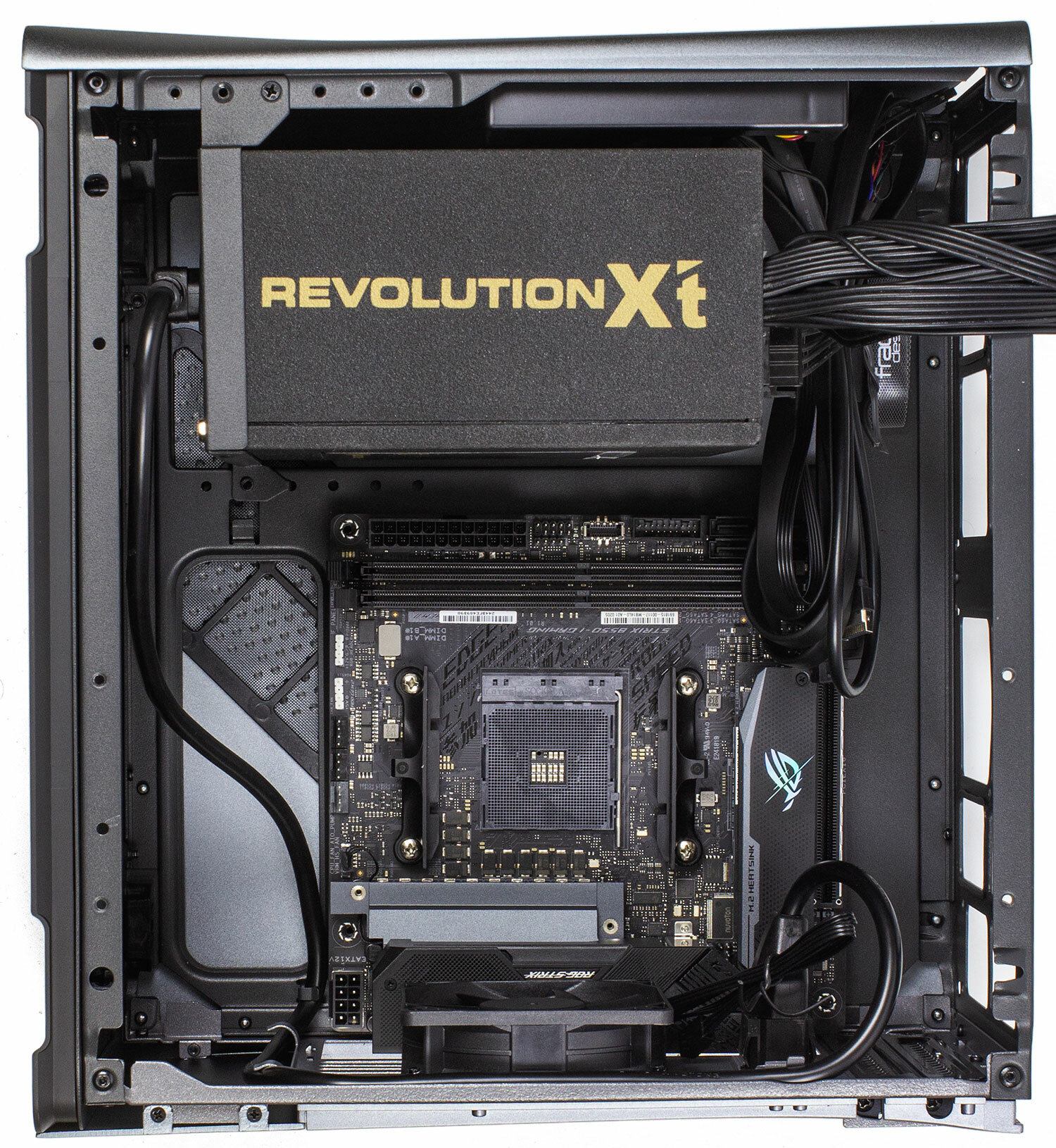 Хорошо видно место под материнскую плату. Её форм-фактор должен быть mini-ITX. Проблем с креплением нет, подключением — тоже. Примерно так выглядит система с платой и блоком питания ATX: