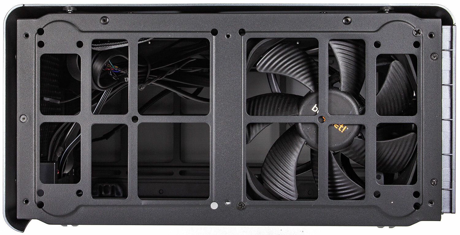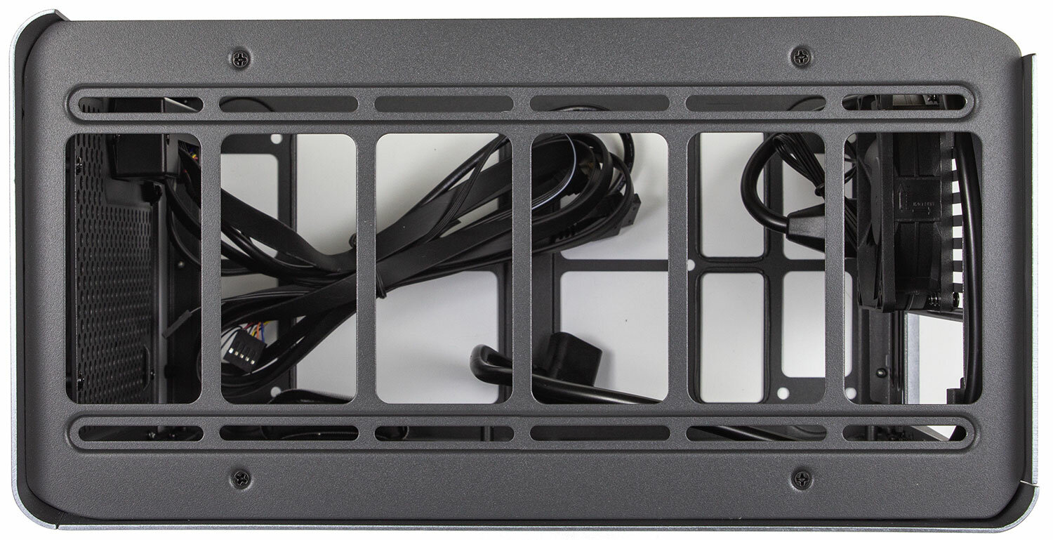 Металлическая панель, с вентиляторами, как видно, тоже съемная. Это очень удобно, так как при сборке более-менее мощных конфигов (а их можно сюда утрамбовать) с корпуса придется скидывать все, оставляя только стальной каркас. Я в таком собрал две системы с Ryzen 9 3900X и GTX 1060 вместе с блоком питания ATX на 850 ватт. 850 потому, что была возможность взять «платиновые» (с высоким КПД, а значит, холодные) блоки премиум-класса по «старым» ценам. Так вот, через снятую верхнюю крышку крепил кулер к матплате, подлезть сверху варианта не было вовсе. Поэтому эндоскоп, пинцет и наживление винтов почти на ощупь.