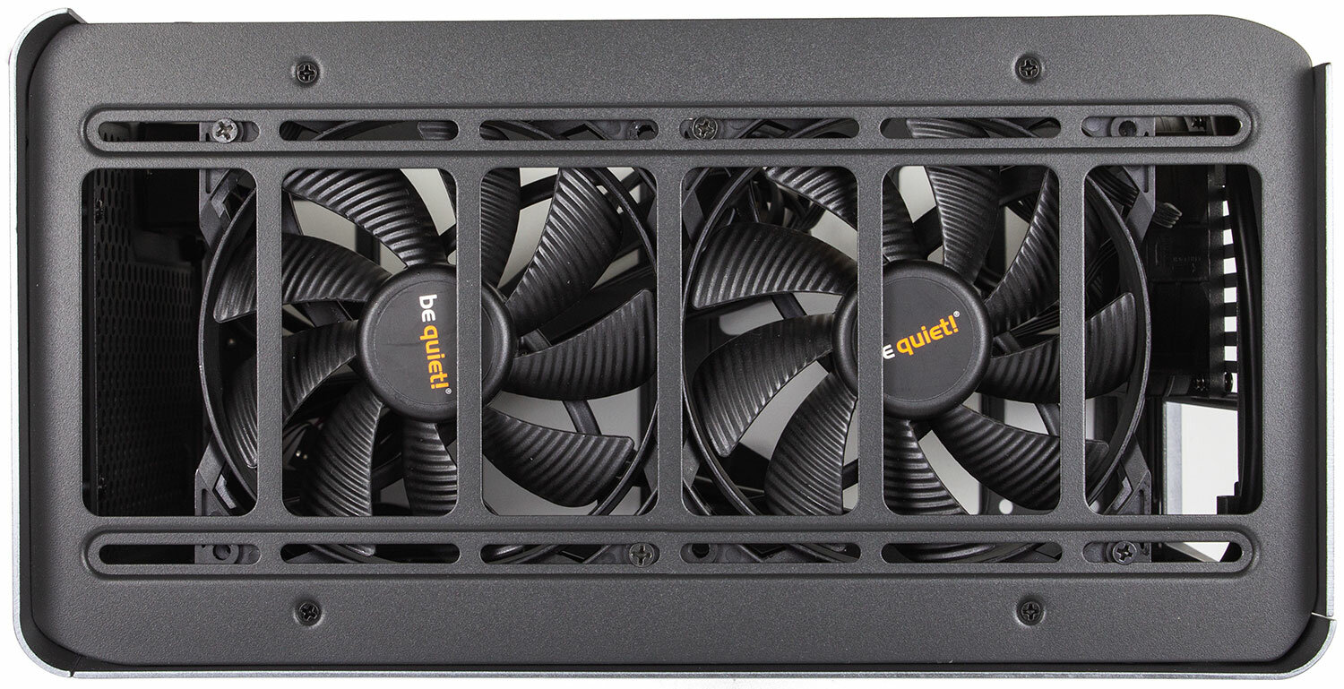 Решение? Отказ от нижних вентиляторов, протягивать воздух снизу вверх будут вентиляторы на верхней крышке. 80-мм вентилятор, кстати, ставить на выдув и давить по оборотам в ненагруженном режиме, пластиковая решетка мало того что создает приличное сопротивление, так ещё и посвистывает на высоких оборотах.