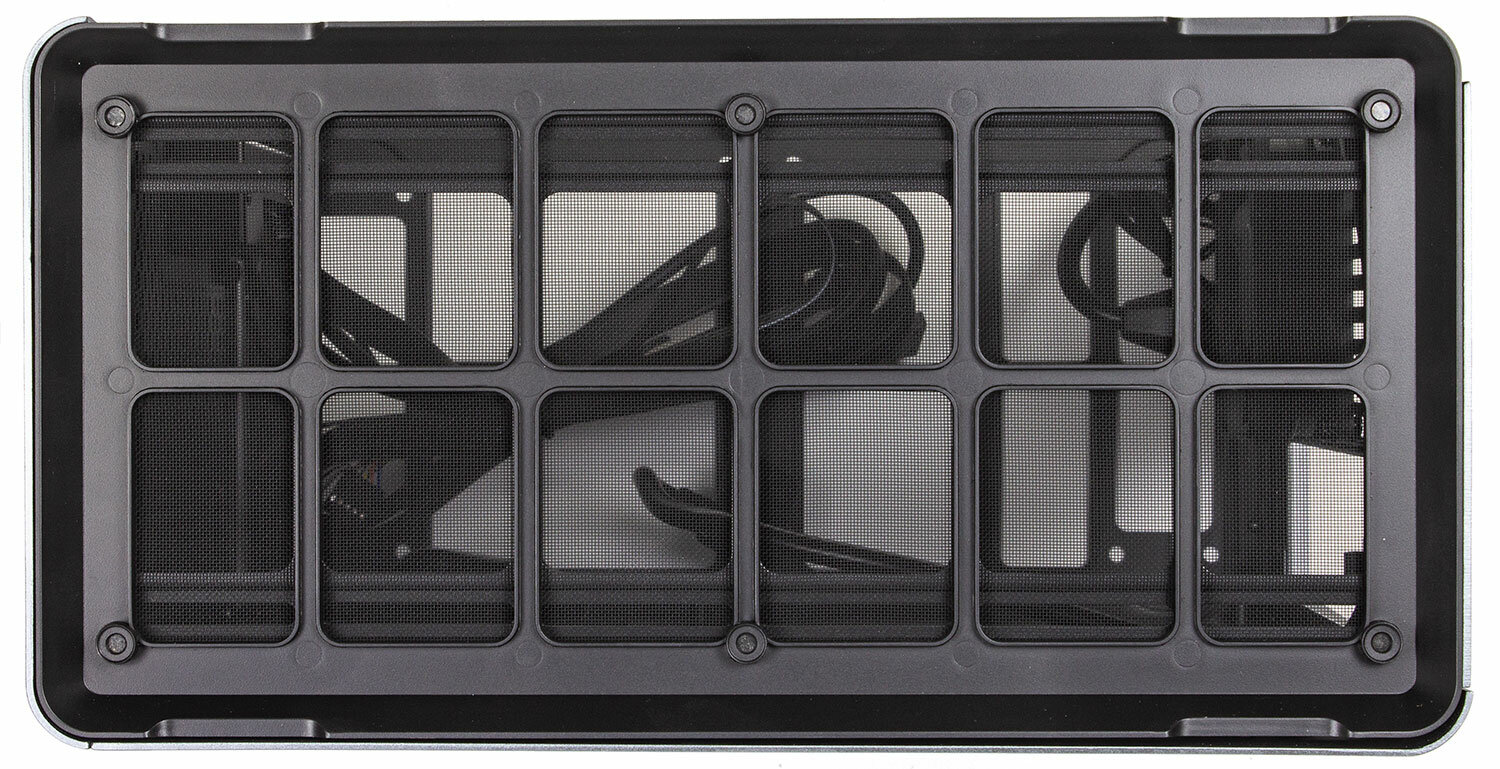 Сверху на вентиляторы установлена на магнитах (!) пластиковая рамка с сеткой. Хорошее решение от падения пыли сверху.