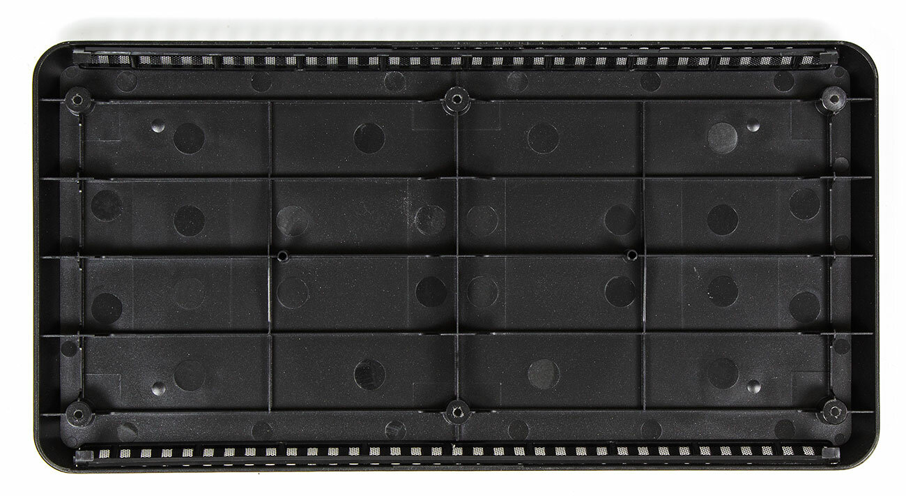 Снизу — пластиковый «поддон» с вентиляционными прорезями.