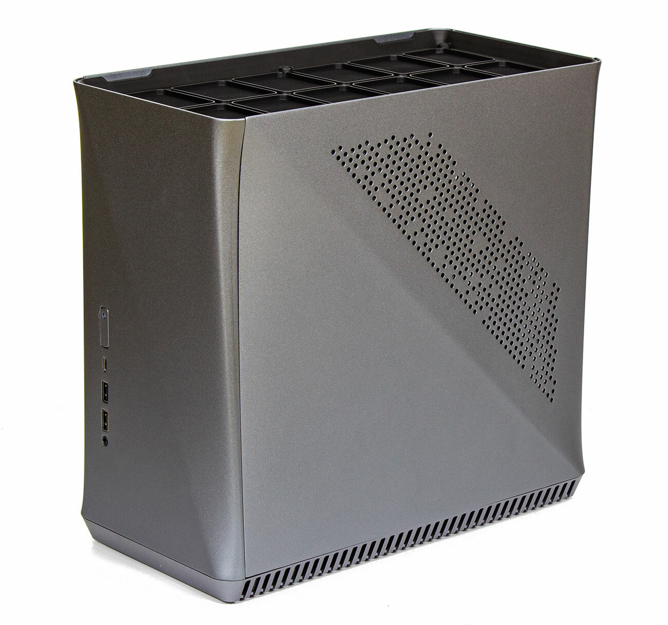 На вид почти правильный параллепипед, над которым аккуратными мазками потрудился дизайнер, чтобы на столе кейс кирпичом не смотрелся. А именно на стол его и стоит устанавливать, на что недвусмысленно намекают разъемы на передней панели в количестве четырех штук. Кнопка включения почти сливается с корпусом, индикатор белого цвета, средней яркости.