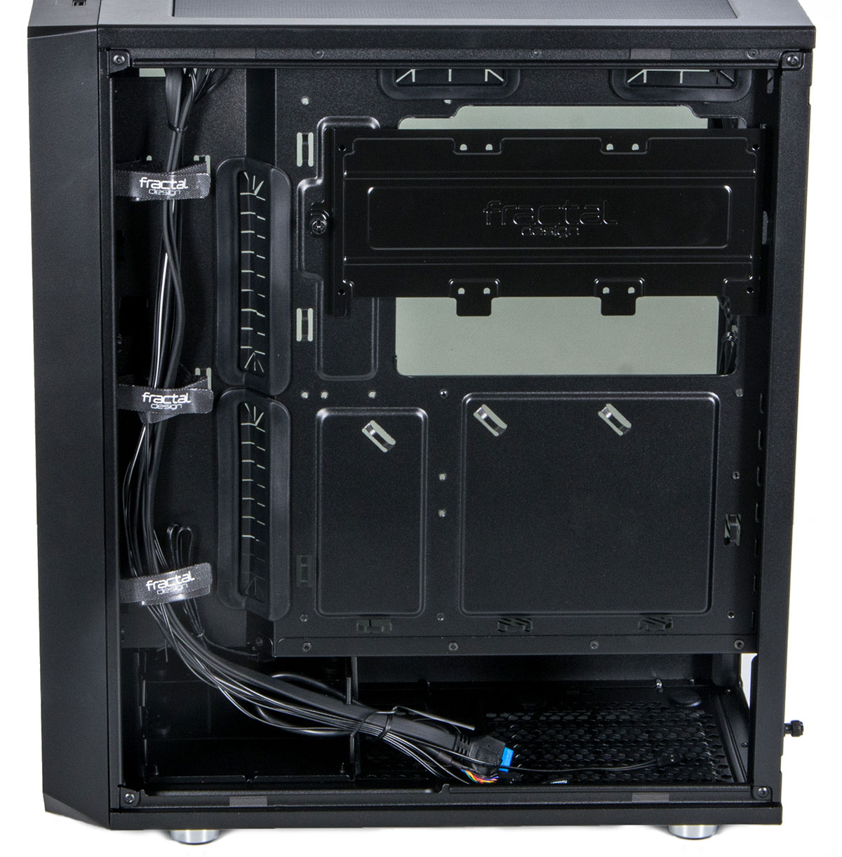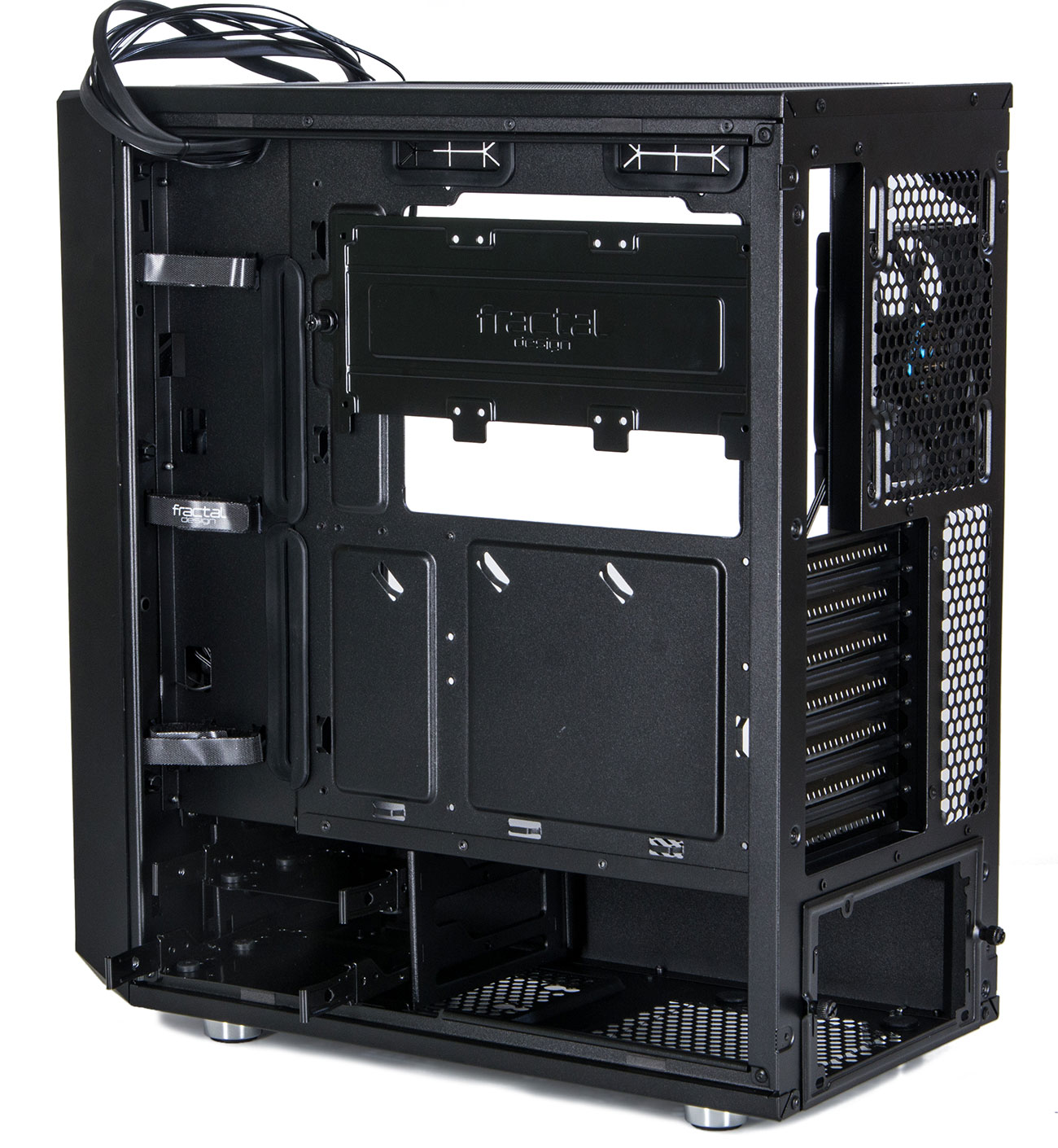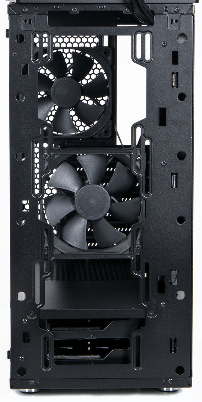 С обратной стороны полно места для укладки проводов и установки разных «непрезентабельных» модулей вроде переходников питания и регуляторов оборотов.