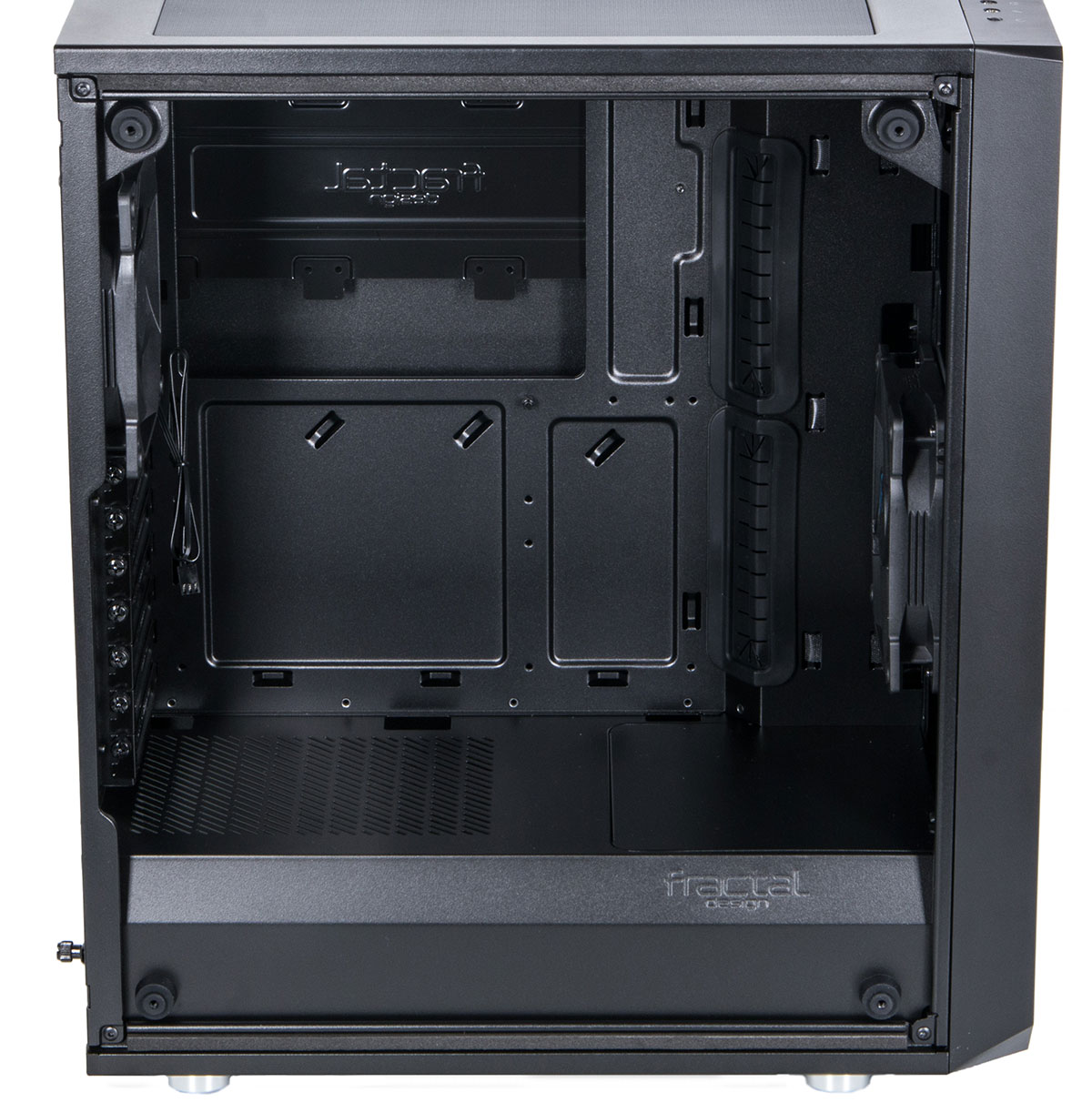 За ним во всю высоту монтажные отверстия под вентиляторы, позволяющие установить либо три стодвадцатки, либо две стосороковки на обдув или же на радиаторы системы жидкостного охлаждения, от одной до трех секций. На «обычных» дешевых корпусах приходится прибегать к помощи металлорежущего инструмента. Предусмотрена возможность регулировки расположения вентиляторов по высоте.
