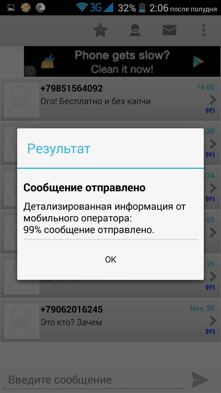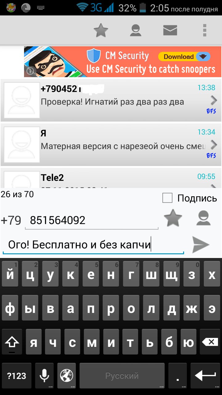 Бесплатные SMS-сообщения по всей России, независимо от оператора. Приложение не использует парсинг операторов, а отправляет SMS напрямую. Могут быть блокированы сообщения, содержащие спам, фрод / фишинг (мошенничество), флуд, оскорбления, угрозы и шантаж. Ограничение — 3 сообщения в час.