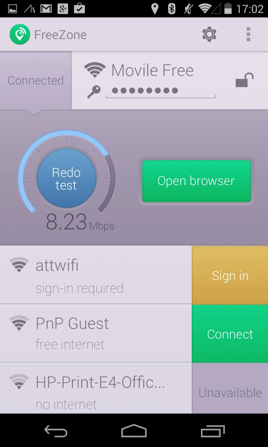 Free Zone WiFi для Android — Самый простой способ подключиться к бесплатным сетям Wi-Fi: Как только вы окажитесь в зоне действия бесплатной сети, вы будете автоматически подключены к ней. Найдите бесплатный доступ к Интернету: на карте приложения вы можете увидеть более 5 миллионов сетей Wi-Fi, которыми можно воспользоваться. Загружайте и сохраняйте свои данные, экономя заряд батареи. Поделитесь информацией о любых найденных вами новых сетях со всеми пользователями. Чем больше сетей Wi-Fi будет добавлено членами сообщества, тем больше возможностей бесплатного доступа к Интернету откроется перед всеми пользователями.