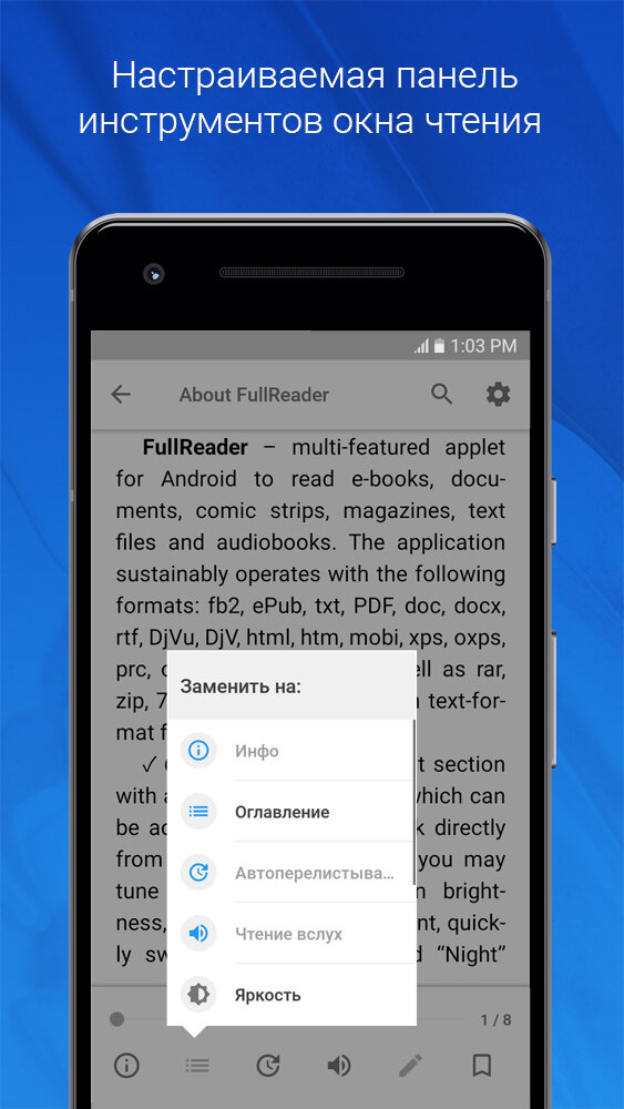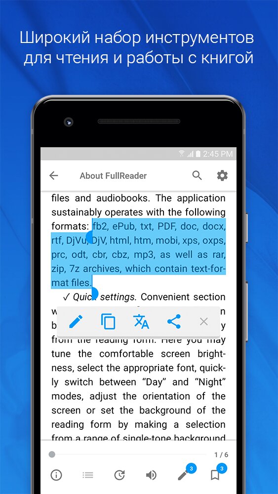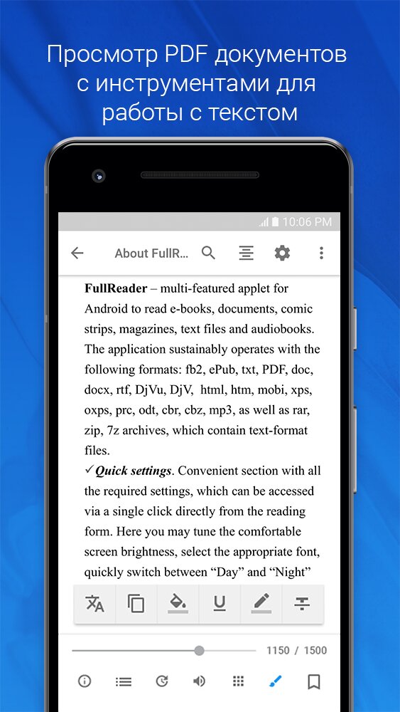 FullReader — многофункциональное читалка для Android предназначена для чтения электронных книг, просмотра PDF и DjVu файлов, журналов, комиксов, а также прослушивания аудиокниг и работы с документами.