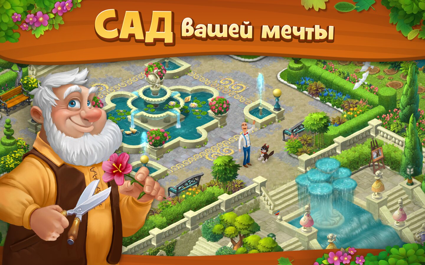 Gardenscapes — веселая и красочная игра, в которой веселые персонажи вместе с вами будут участвовать в восстановлении прекрасного сада.