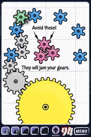 Geared — очередная логическая игрушка. У игрока есть желтая шестерня — ведущая, голубая(ые) — ведомые и прочие, чтобы их соединить.