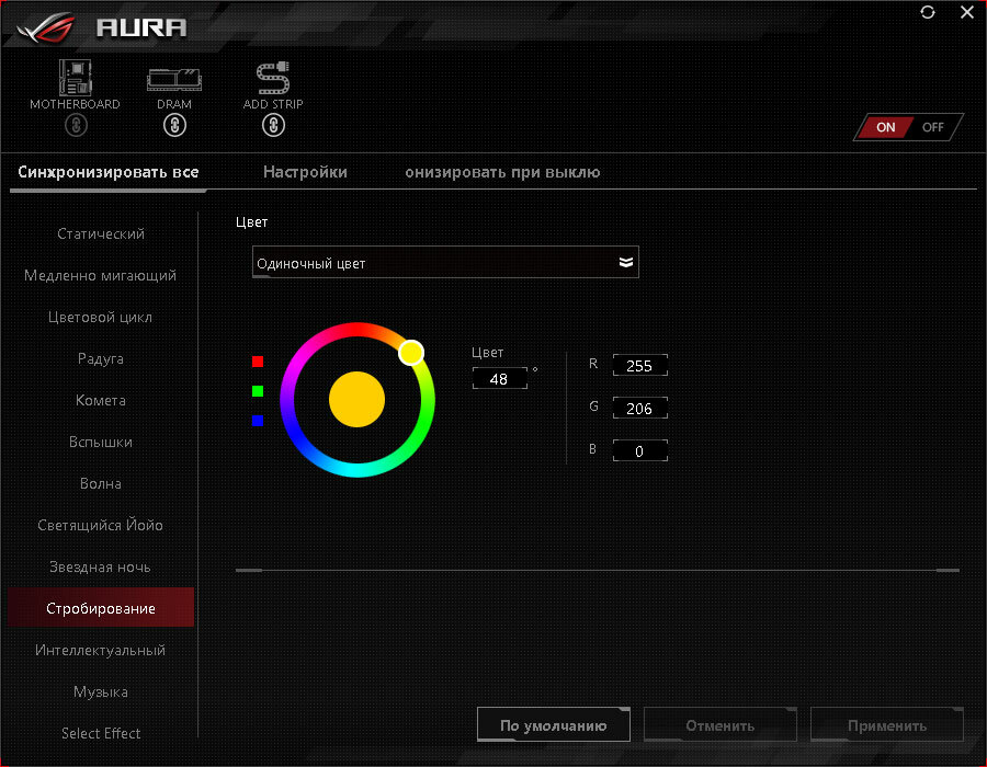 ASUS Aura корректно опознала модули и позволила настроить их под свой вкус, синхронизировав с материнкой Maximus XI Formula.