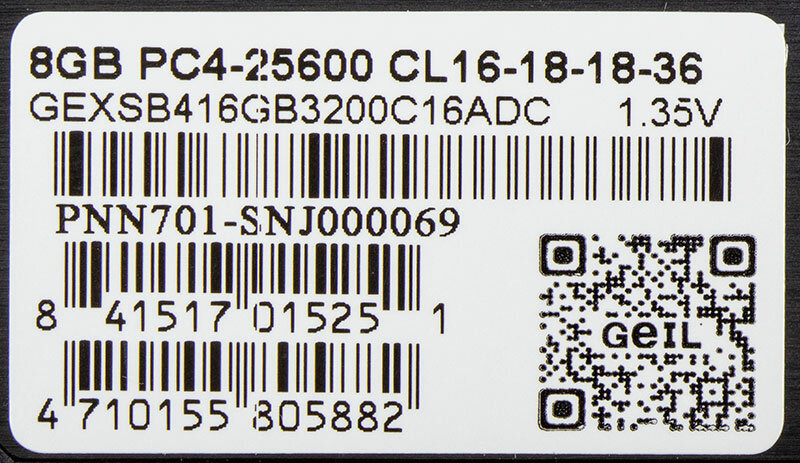 Как гласит наклейка, модули способны работать на частоте 3200 МГц при таймингах 16-18-18-36 и напряжении питания 1,35 В.