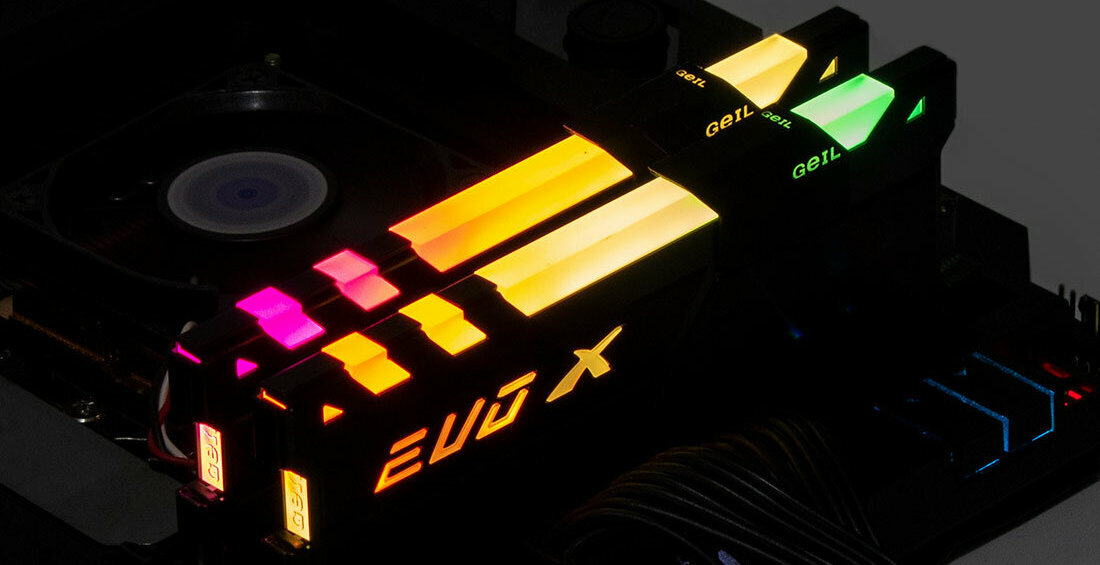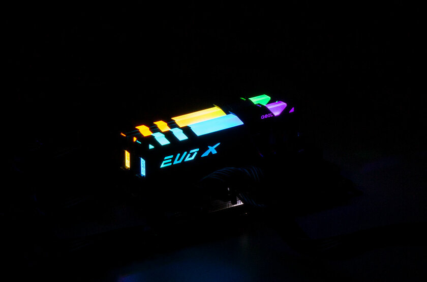 GeIL Evo X II DDR4-3200 — хорошая оперативная память, особенно для тех, кто приветствует всякого рода подсветку внутри системного блока. Редкие комплектующие светят в темноте так же эффектно и ненапряжно, как этот комплект. Да и с фирменным ПО дружит хорошо.