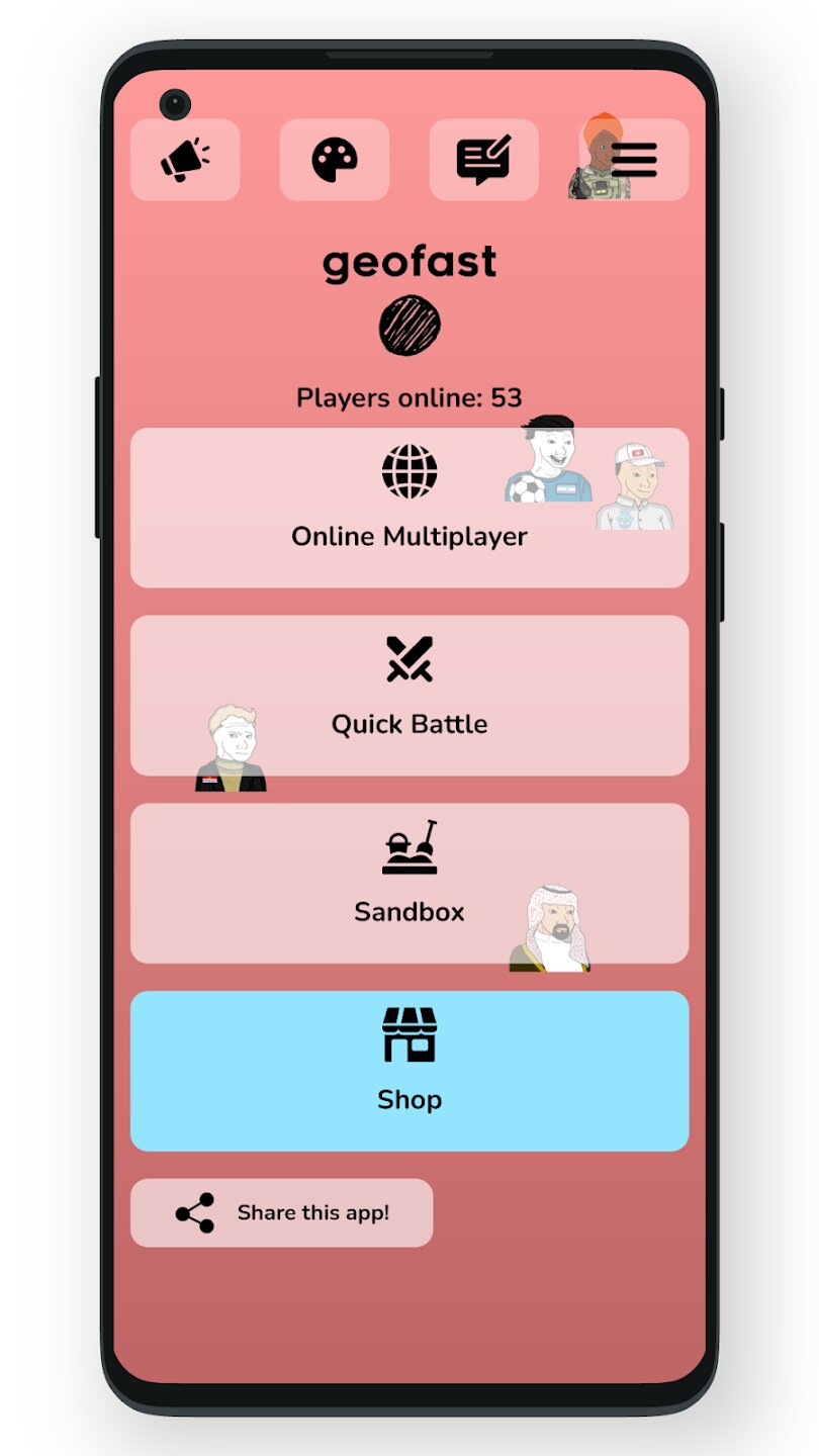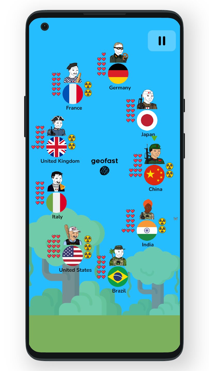Geofast: Battle of Nations — это стратегическая военная игра, в которой вы выбираете свою страну и сражаетесь за господство на глобальном поле боя. Участвуйте в напряженных пошаговых сражениях и приведите свою страну к победе, перехитрив противников и координируя мощные атаки.