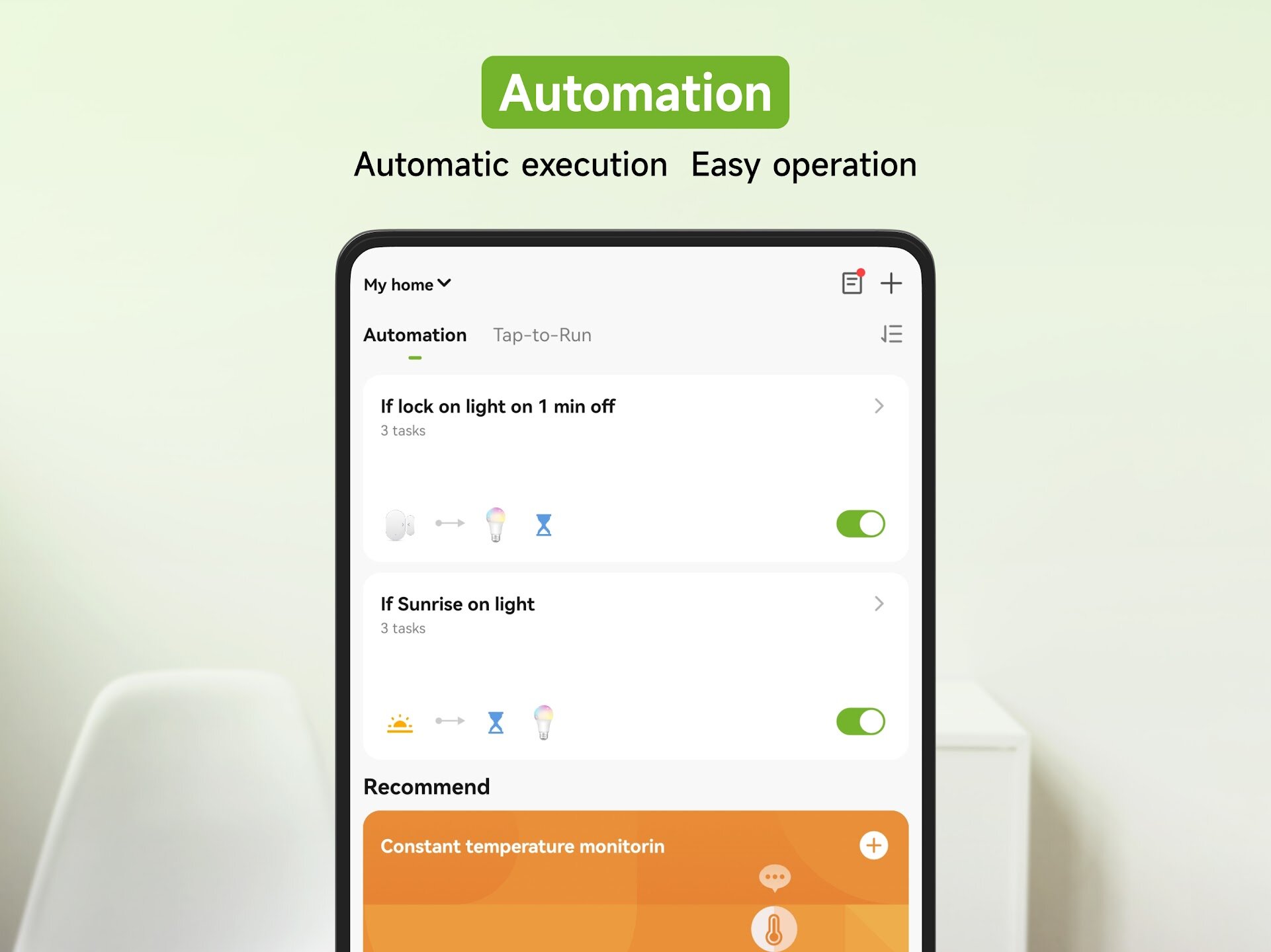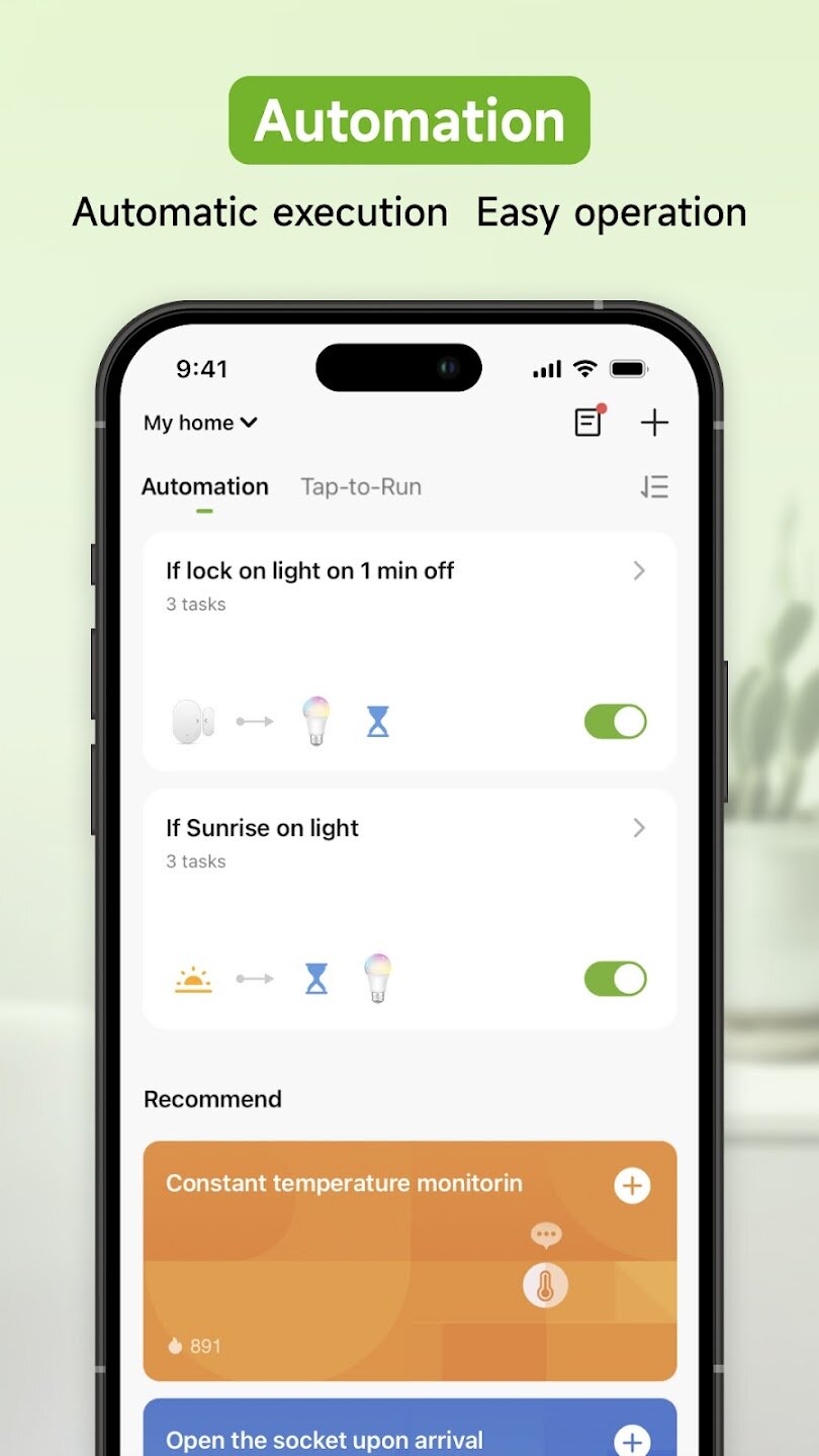 - Интеллектуальное подключение: автоматический запуск умных устройств в зависимости от вашего местоположения, температуры, местоположения и времени
