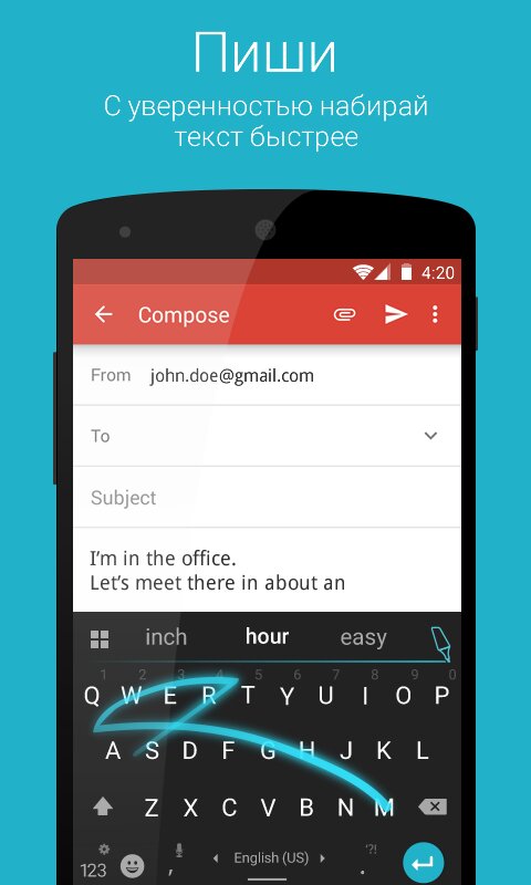 В этой клавиатуре огромное количество различных эмодзи, которые вы можете использовать в любой момент. Также, вы можете персонализировать клавиатуру, сделав ее под себя. В приложении множество стилей, из которых вы сможете выбрать подходящий для себя. Вводите слова не отрывая пальца от клавиатуры, это ускорит ввод слов в несколько раз. Также, приложение может озвучивать введённый текст на английском.