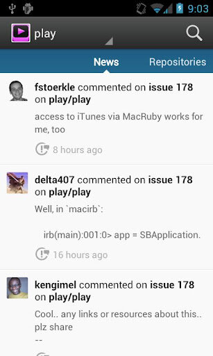 GitHub показывает обновление issues, gists и ленты новостей от всех друзей и репозиториев. Доступа к исходникам нет.