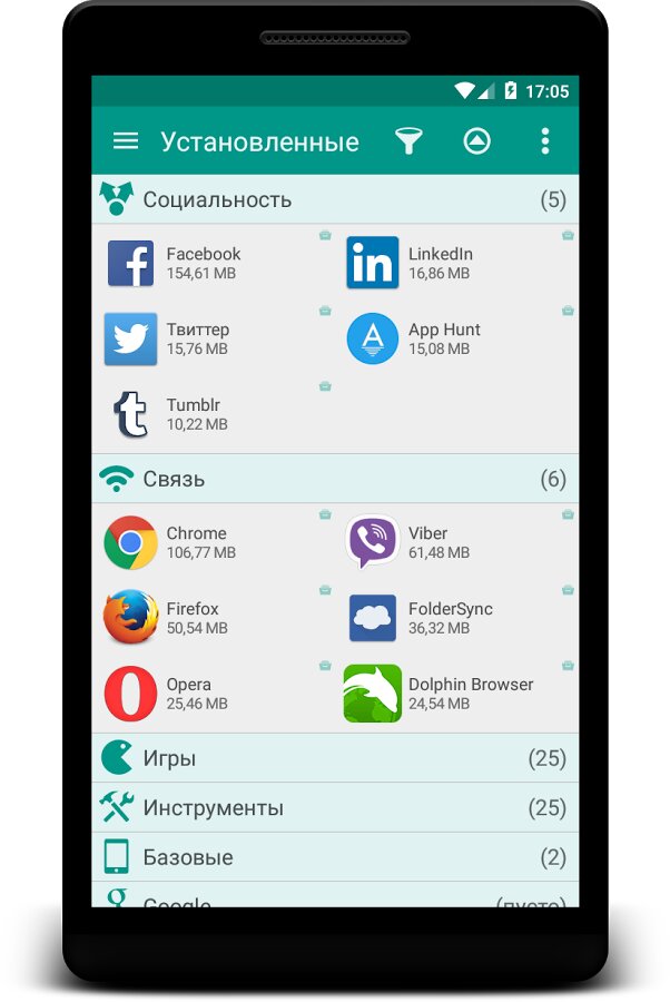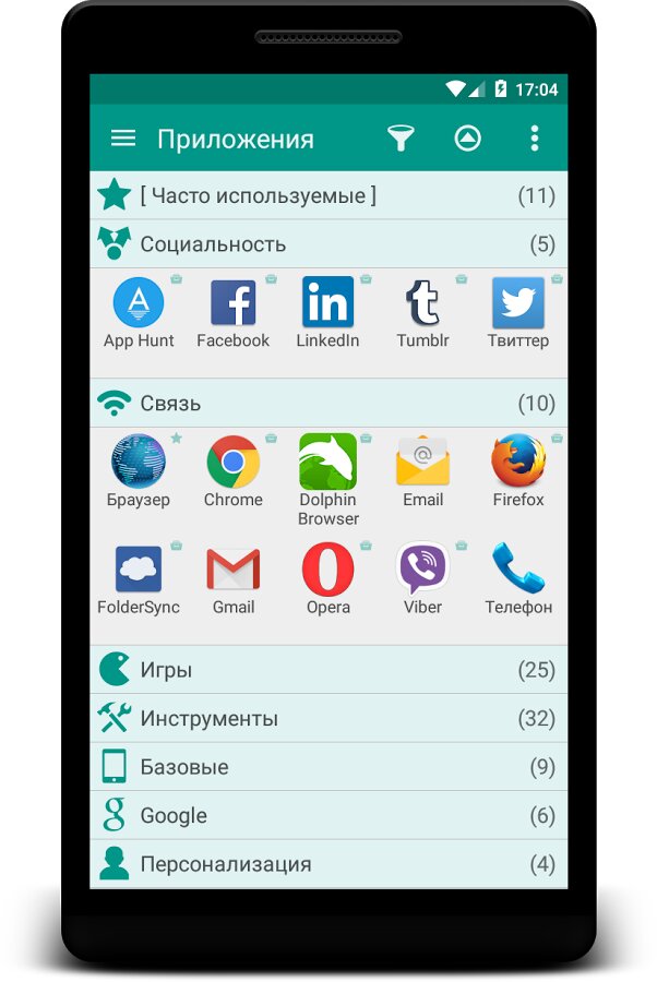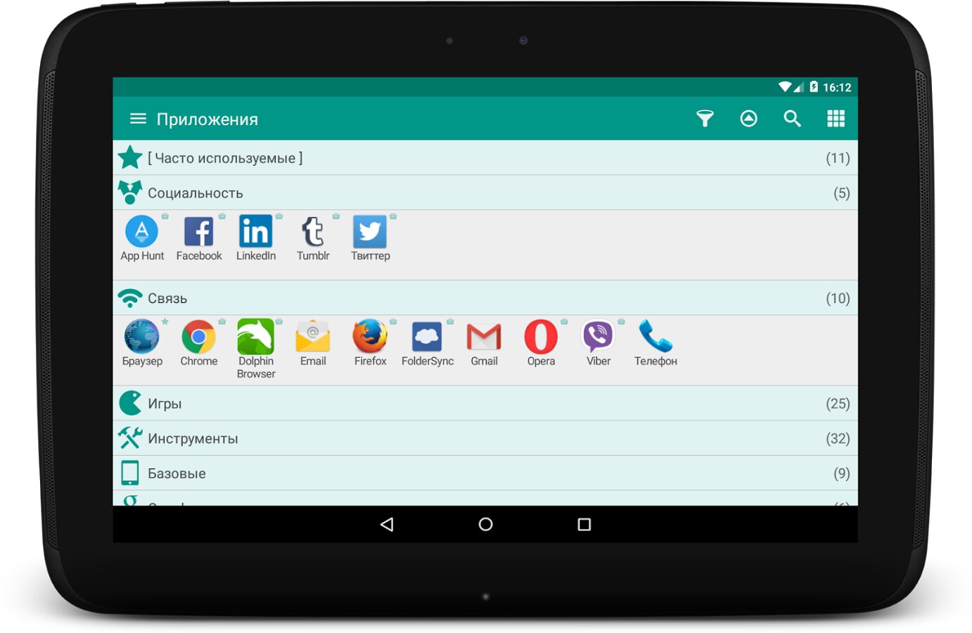 - Органайзер приложений. Организуйте свои приложения с помощью функции автоматической группировки в папки, которая основана на категориях Google Play. Вновь установленные приложения могут быть распределены по категориям автоматически. Если вы хотите получить более персонализированную структуру, создайте свои собственные папки или просто переименуйте предопределенные. Можно одновременно распределить каждое приложение по нескольким группам в соответствии с вашими потребностями. Используйте системные папки для быстрого доступа к наиболее используемым, последним используемым или последним установленным приложениям.