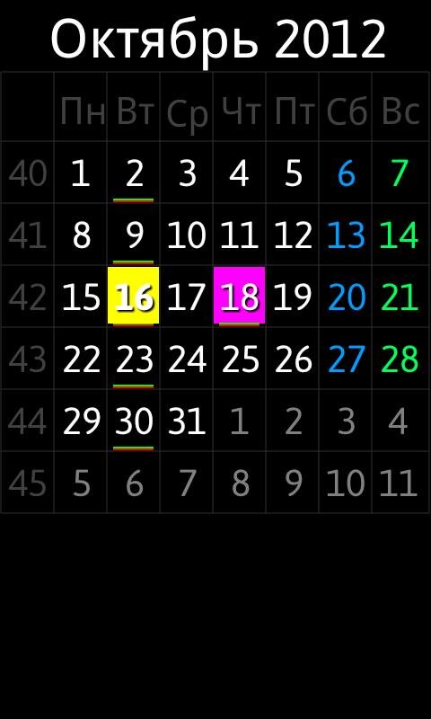 - Возможность отметить любой день как рабочий, сокращенный, выходной или отпуск с подсветкой разными цветами