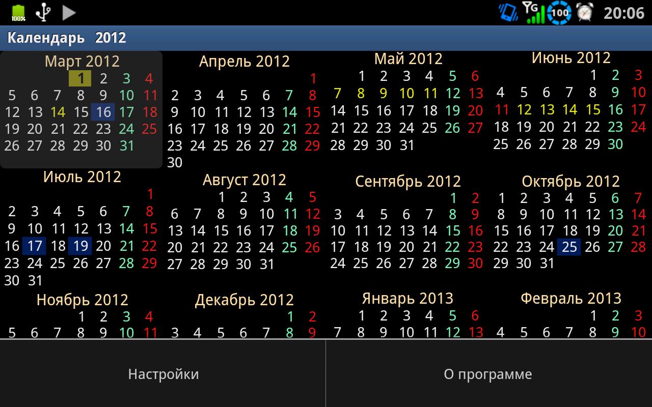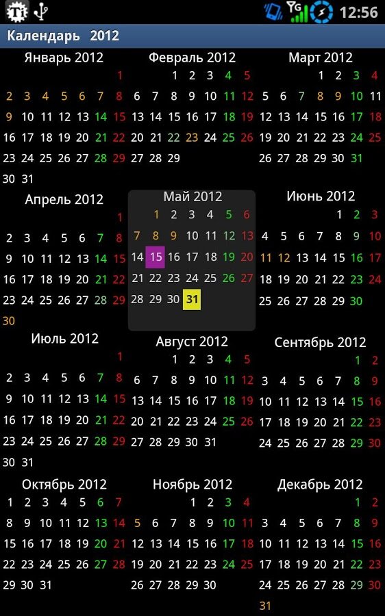 - Годовой календарь на текущий год на полный экран и выбор просмотра отдельно по месяцам.