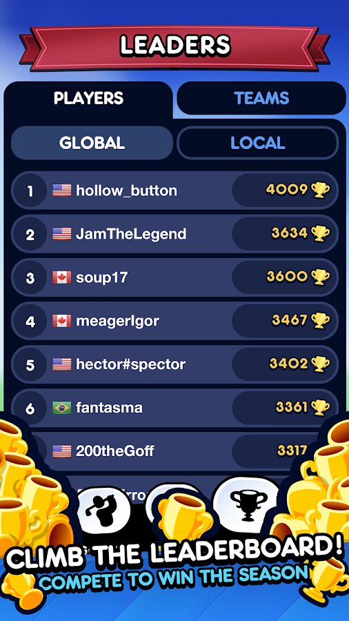 - Объединяйтесь в команды для участия в дружеских матчах, ведения таблицы лидеров вашей команды и общения в чате