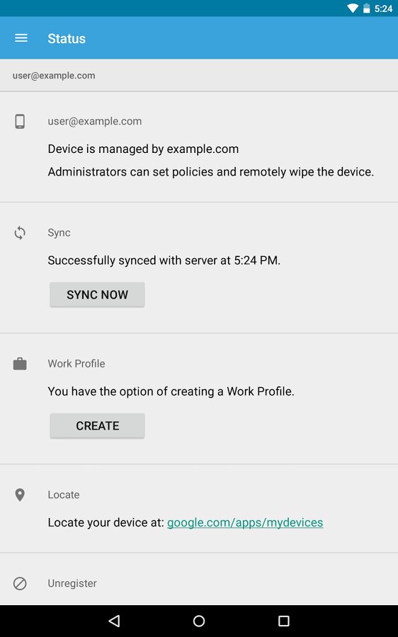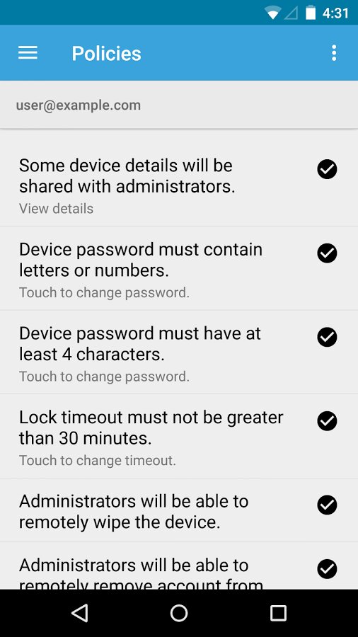 Приложение Google Apps Device Policy для Android позволяет активировать на Android-устройстве правила, которые защищают его в случае потери или кражи. После установки Device Policy администратор сможет настроить запрос пароля на устройствах пользователей, чтобы повысить уровень безопасности. Кроме того, в случае потери устройства с него можно будет дистанционно удалить все данные.