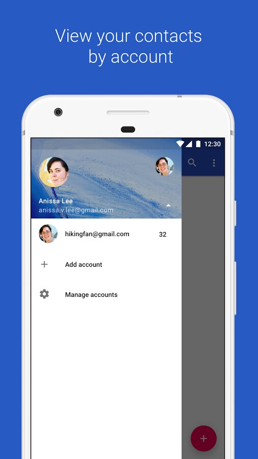 - Просматривайте контакты по аккаунту (например, отдельно рабочие и личные контакты).