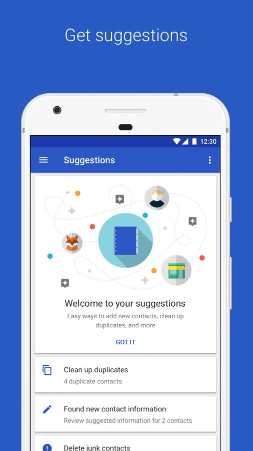 - Получайте предложения по добавлению новых контактов, удалению дублирующихся записей и другие.