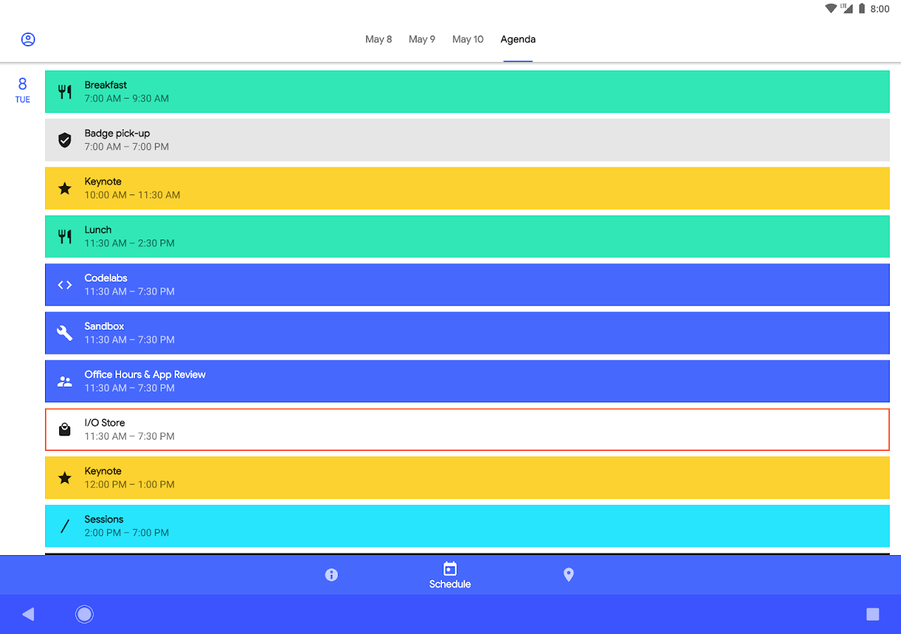 Google I/O – ваш гид по фестивалю. В нем собраны сведения о встречах и их онлайн-трансляциях. Вы сможете: