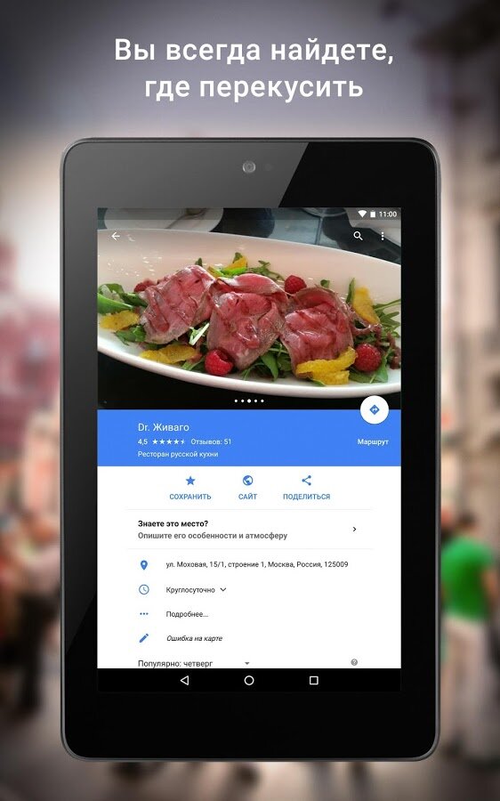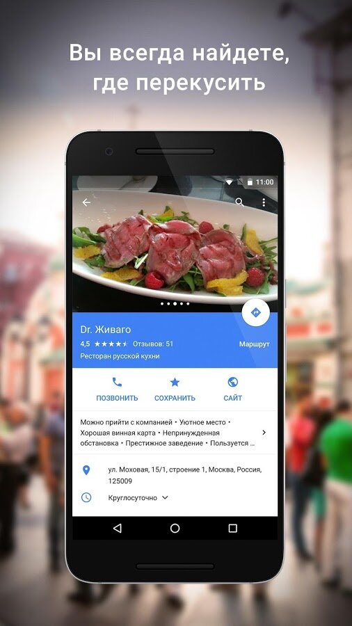 - Можно посмотреть точное время работы магазинов, парков и прочего.