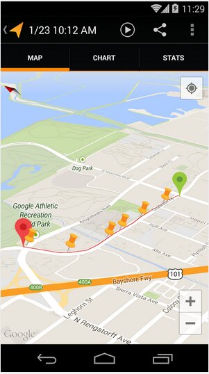 Приложение поддерживает синхронизацию треков с Google Диском. Эта функция пригодится, если вы захотите обмениваться треками с друзьями или публиковать их в социальных сетях, например в Google+, Facebook* или Twitter. Кроме того, треки можно экспортировать в Мои карты, Google Таблицы, а также на внешние носители.