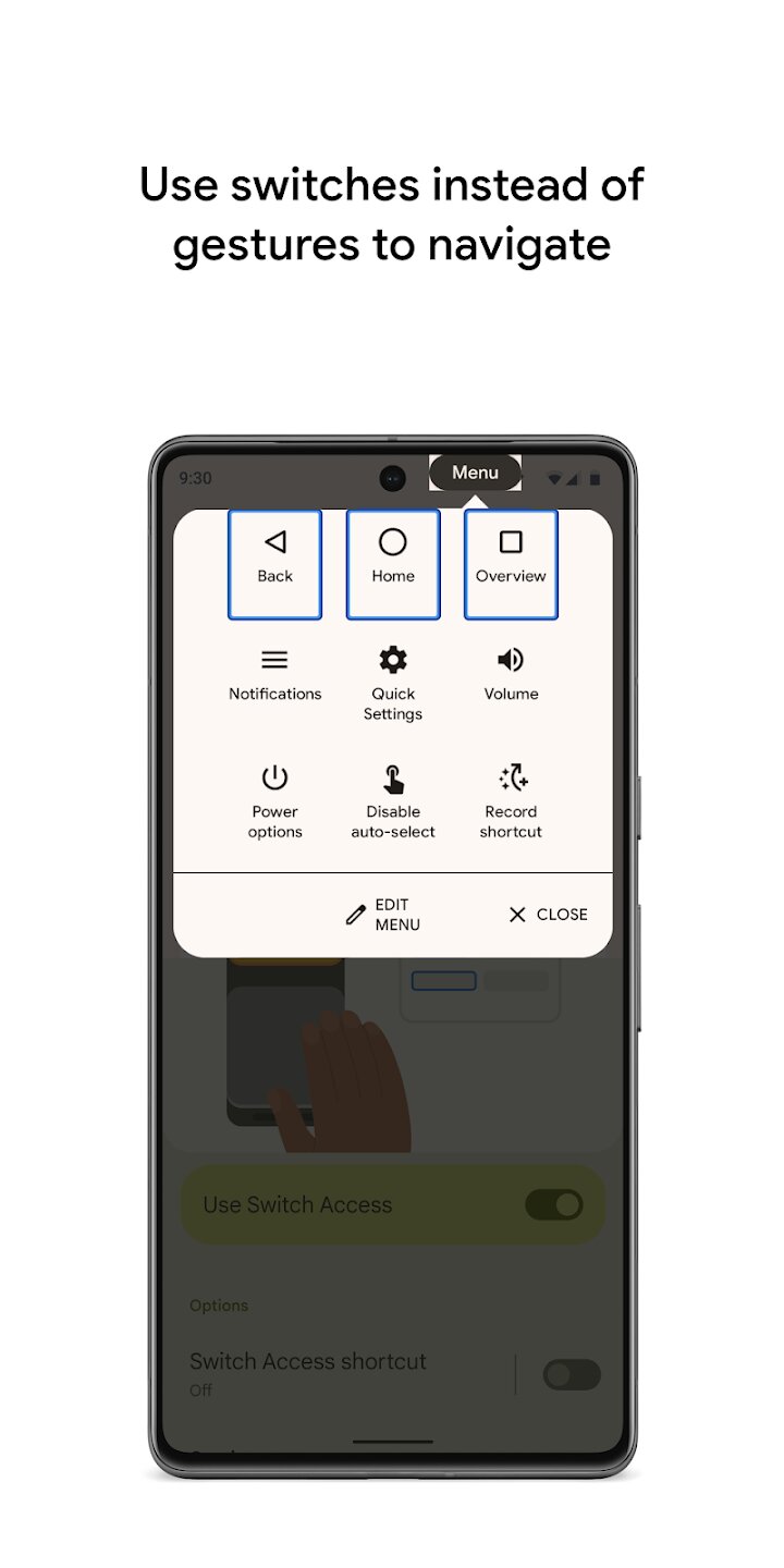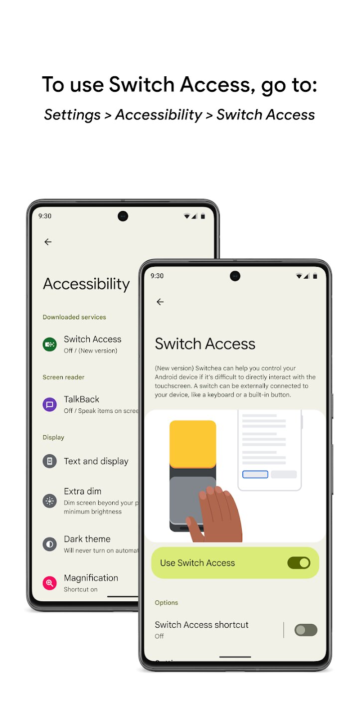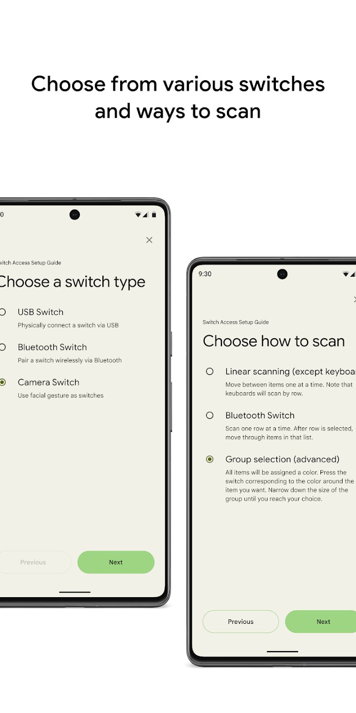 Google Switch Access — это официальный инструмент доступности для Android, который позволяет пользователям управлять своим телефоном или планшетом без использования сенсорного экрана, вместо этого используя внешние переключатели или переднюю камеру устройства. Он разработан, чтобы помочь пользователям, которые испытывают трудности с непосредственным взаимодействием с экраном, позволяя им перемещаться, выбирать, прокручивать, вводить текст и выполнять различные другие действия с помощью настраиваемой системы сканирования.