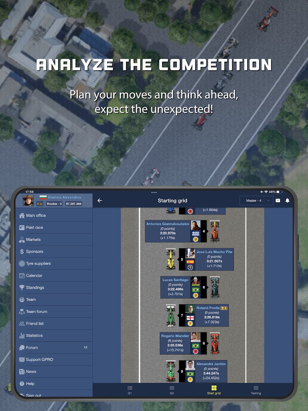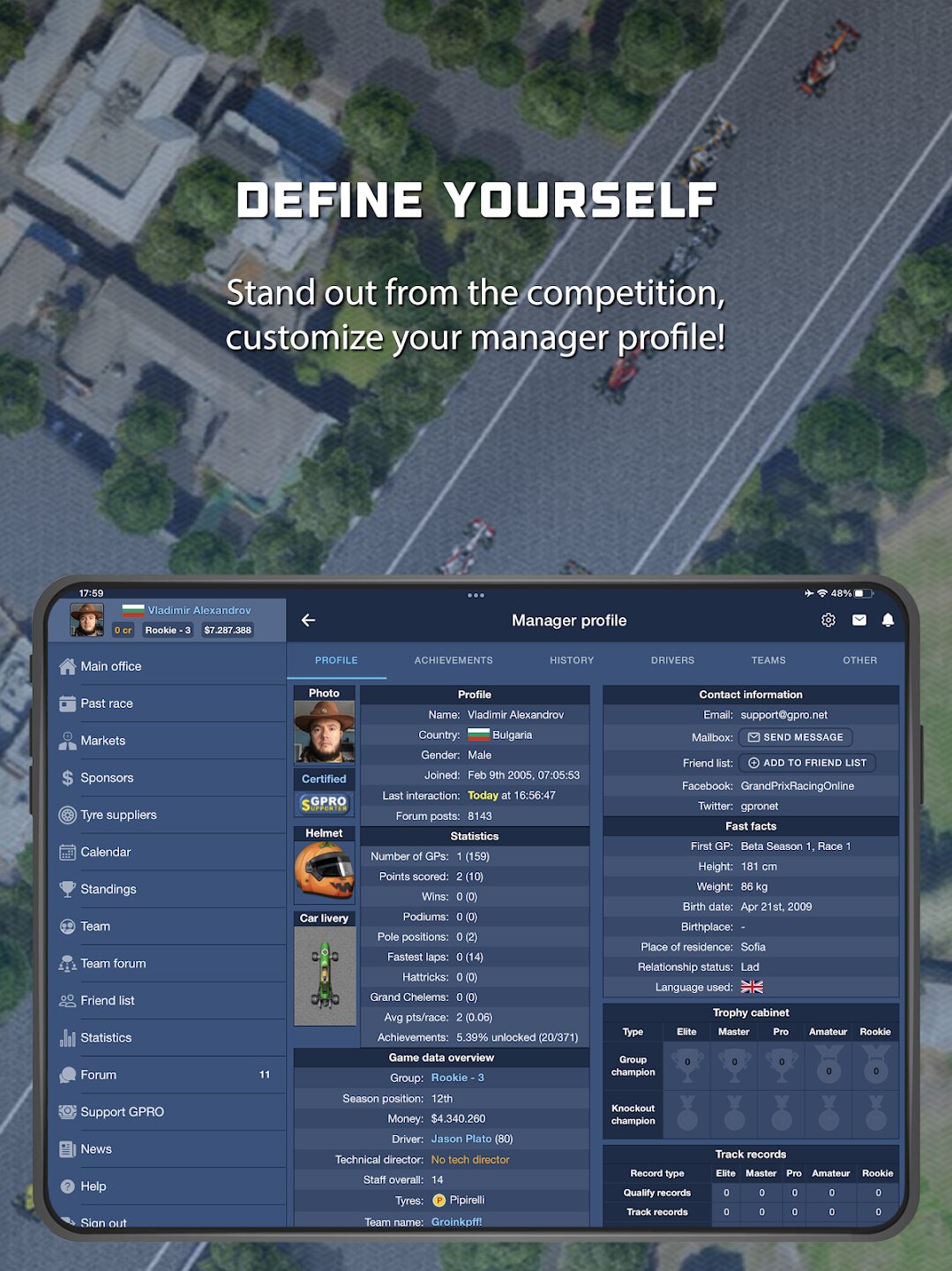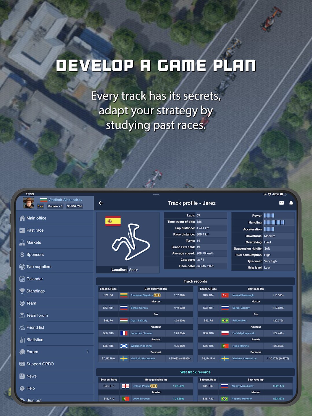 GPRO — это классический онлайн-симулятор управления гоночной командой, в котором вам предстоит создать команду с нуля, стремясь попасть в элитную группу и завоевать титул чемпиона мира. Вы выступаете в роли как руководителя команды, так и гоночного стратега, отвечая за разработку болида, управление финансами, набор персонала и подготовку пилота. На этом пути вам предстоит пройти через несколько классов, столкнуться с финансовыми взлетами и падениями, а также делать разумные долгосрочные инвестиции, чтобы добиться успеха.