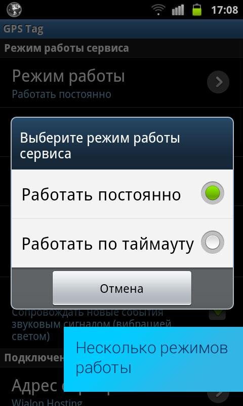 - Работает в двух режимах: постоянном (отправляет на сервер координаты постоянно, при любом удобном случае) и с тайм-аутом (передает координаты один раз в заданный период, снижая расход батареи).