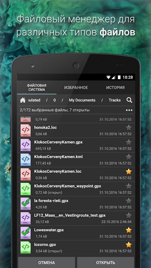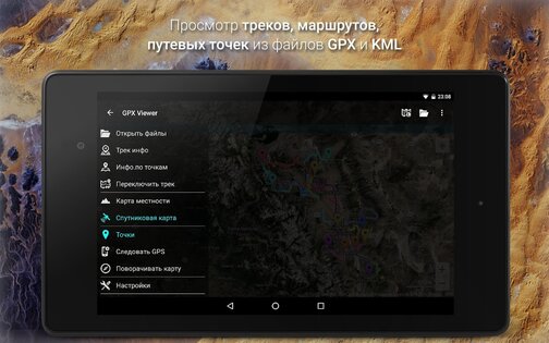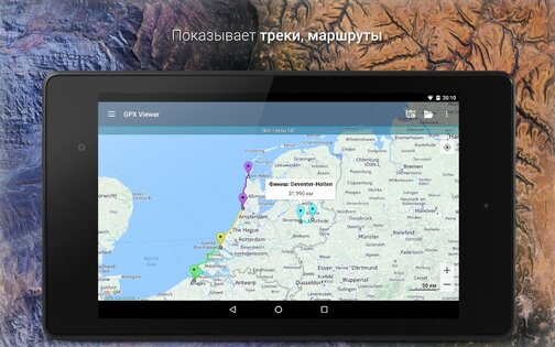- просматривайте треки, маршруты и путевые точки из gpx, kml, kmz и loc файлов
