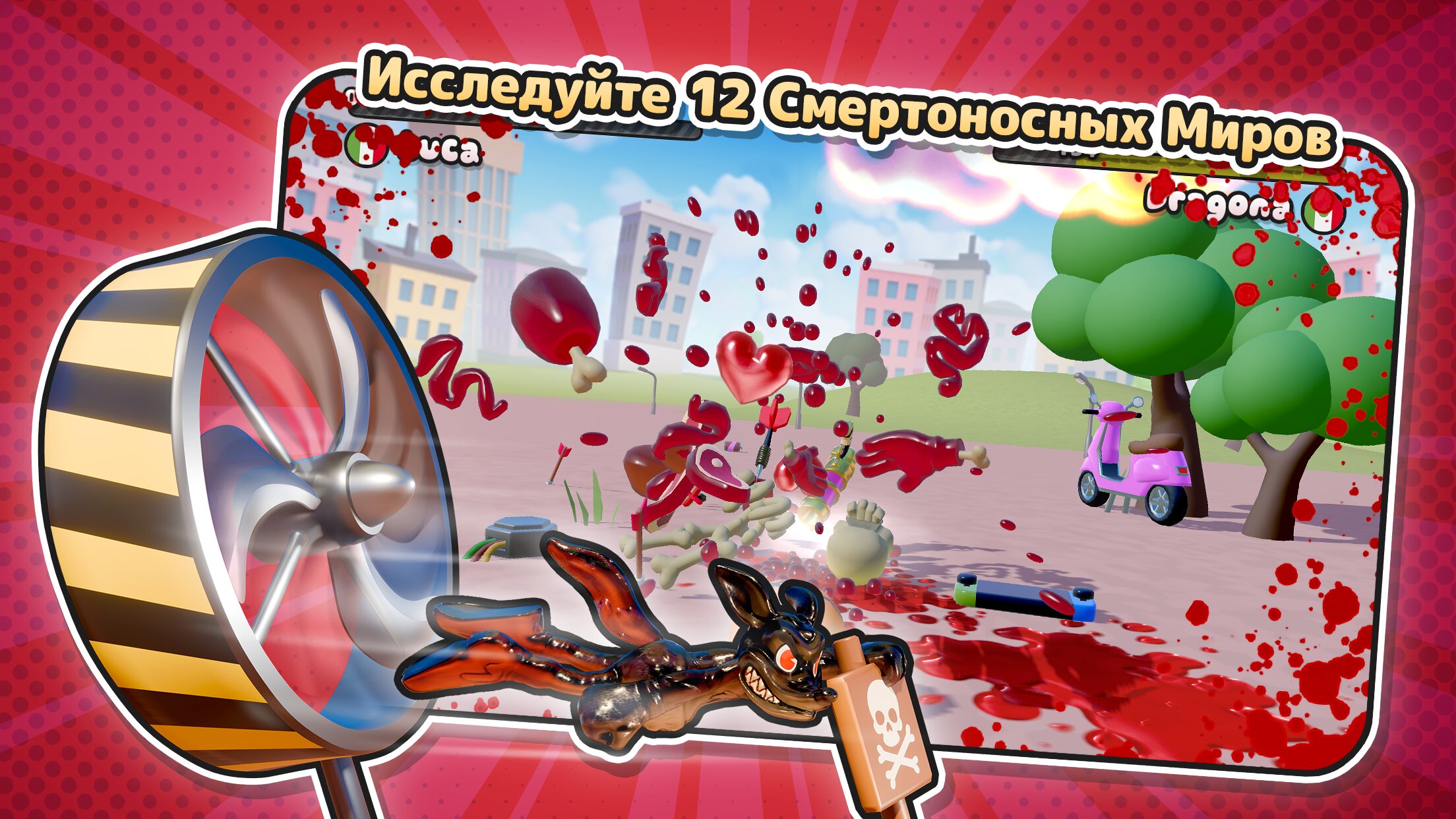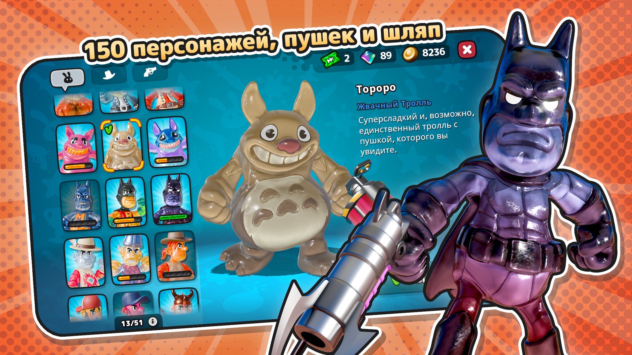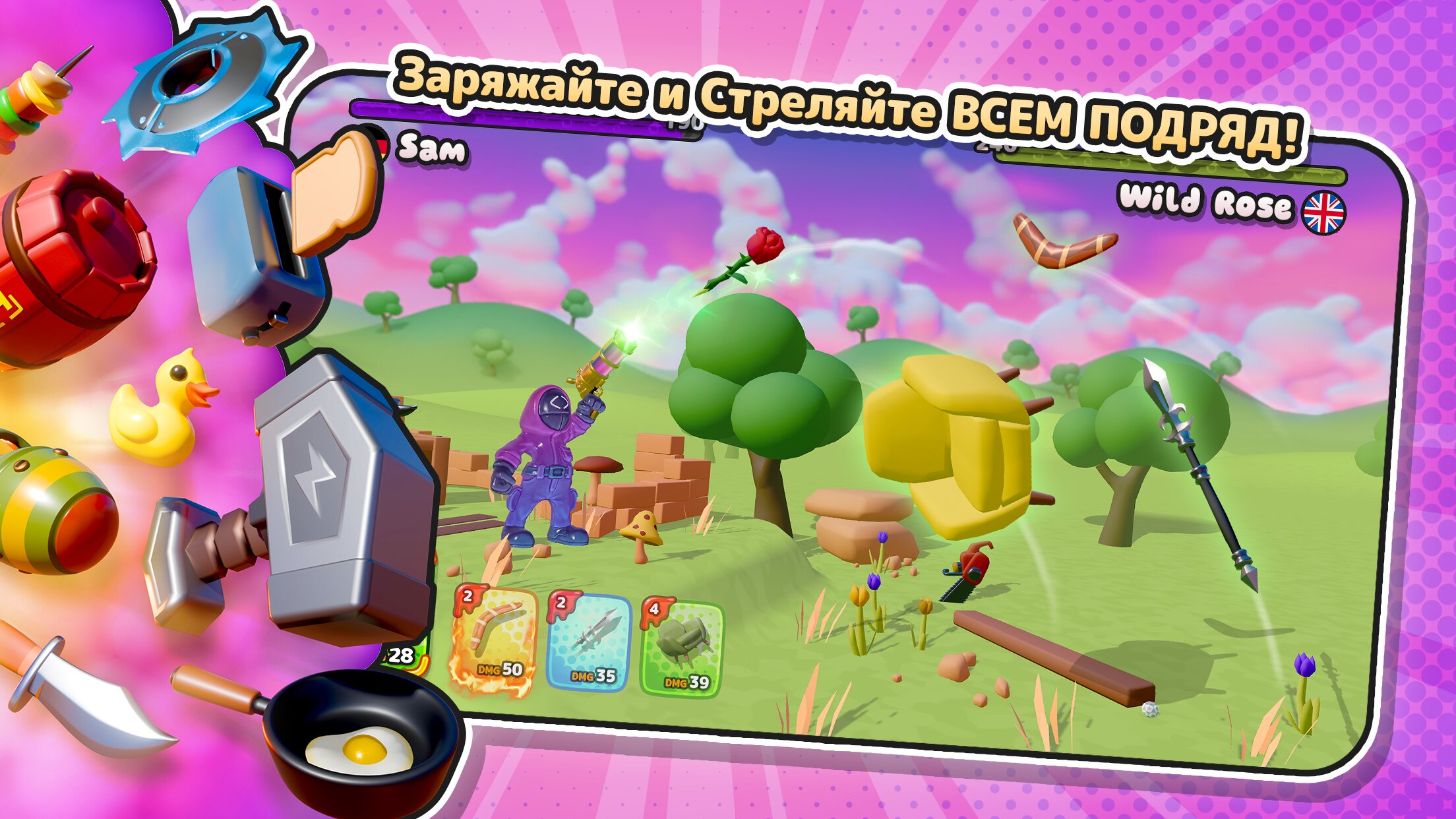 Каждая дуэль основана на уникальном физическом движке, который делает каждый выстрел зрелищным. Смотрите, как ваши жевательные стрелки летают по экрану, получают попадания и взрываются впечатляюще глупыми способами. Исследуйте 12 ярких миров, собирайте и настраивайте более 150 различных персонажей, пушек и шляп, чтобы создать своего идеального стрелка.