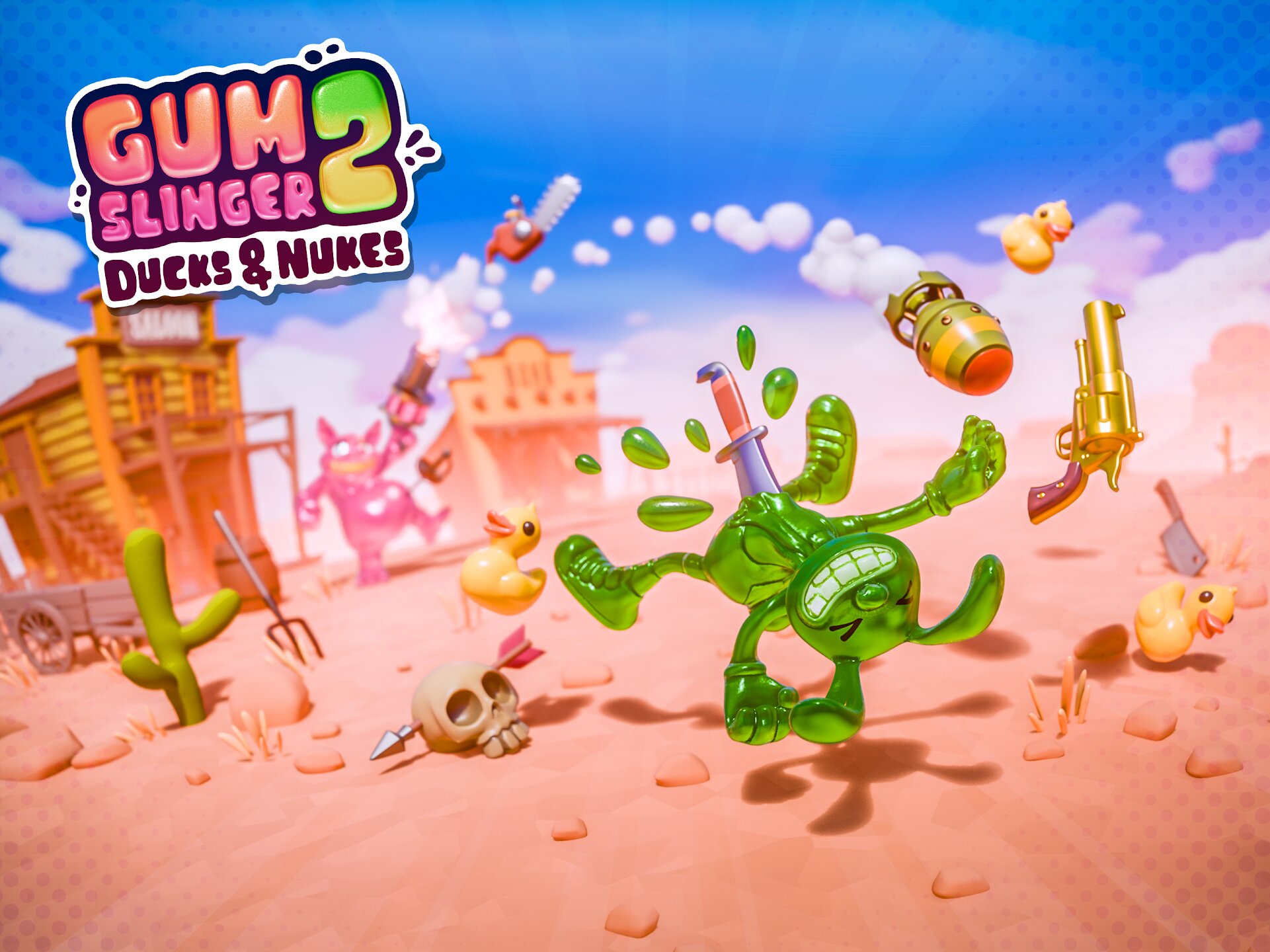Gumslinger 2: Ducks & Nukes — это веселая и хаотичная пошаговая игра-дуэль, в которой жевательные стрелки сражаются в невероятных перестрелках, основанных на законах физики. Вашим боеприпасом является все окружающее пространство: всасывайте предметы, от резиновых уток до ядерных бомб, и стреляйте ими в своих противников в дико непредсказуемых столкновениях, окрашенных в цвета конфет.