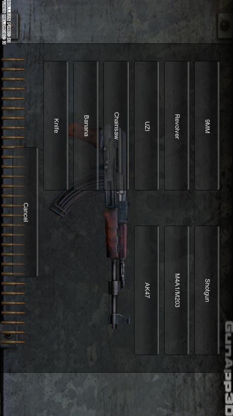 Gun app 3D — оружие для вашего Андроид устройства. Интересное приложение где нажатием на курок можно выстрелить или перезаредить его толчком телефона.В игре неплохой арсенал: M4A1, AK47, 9mm, Revolver, Uzi, Chainsaw, Knife, and Banana