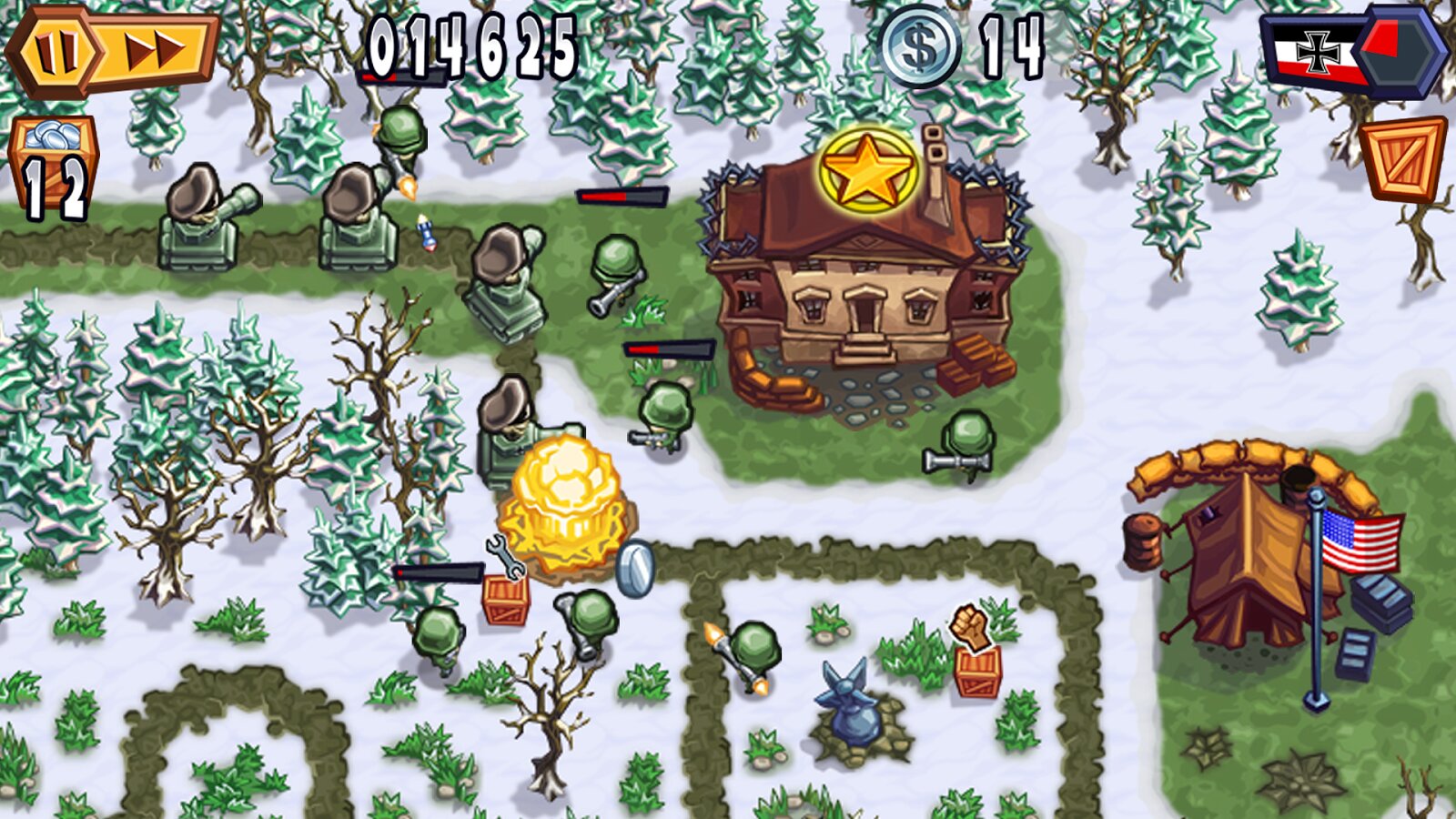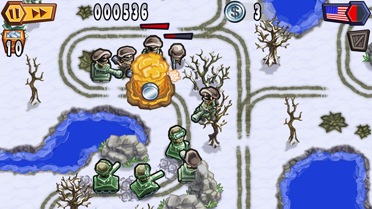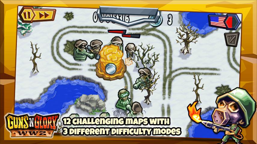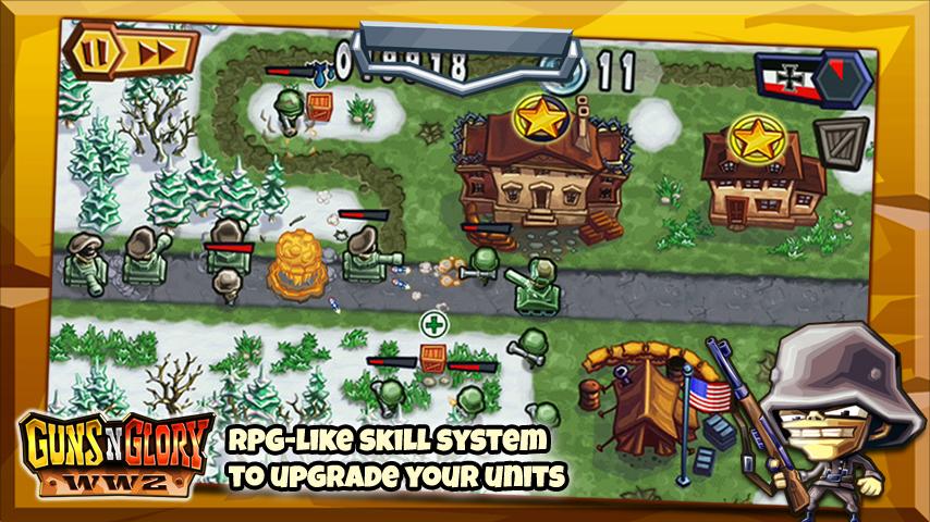 Guns'n'Glory WW2 — захватывающая игра для Android. Играйте за союзников или немцев, защищая свои позиции от атак противника. В вашем распоряжении несколько типов войск, каждый из которых обладает своими уникальными навыками. Плюс к этому возможность улучшать характеристики тех или иных юнитов.Немаловажным фактором в игре является выбранная тактика и размещение ваших войск и войск противника на поле боя. Используйте местность для засад, определит ключевые точки вашей обороны и войска, необходимые для успешной обороны. Не забывайте пополнять свою армию.
