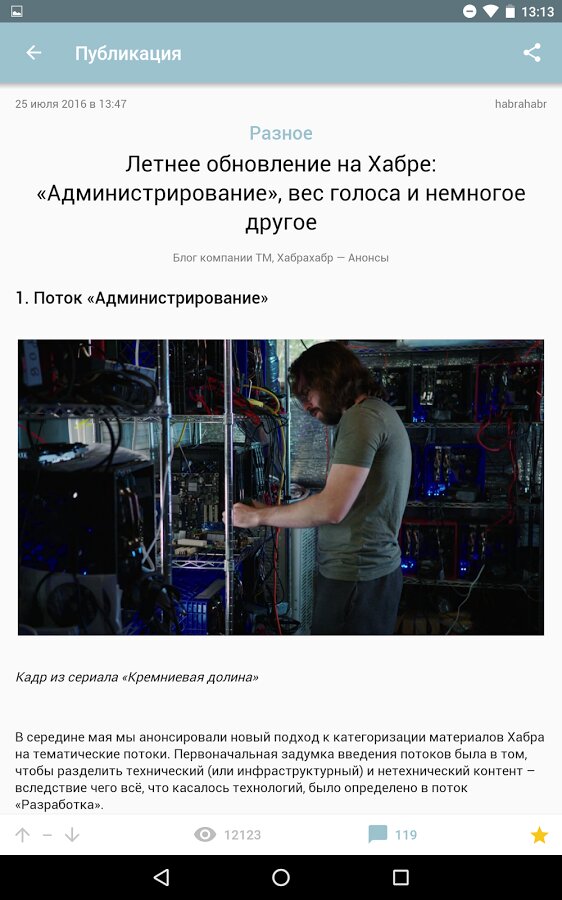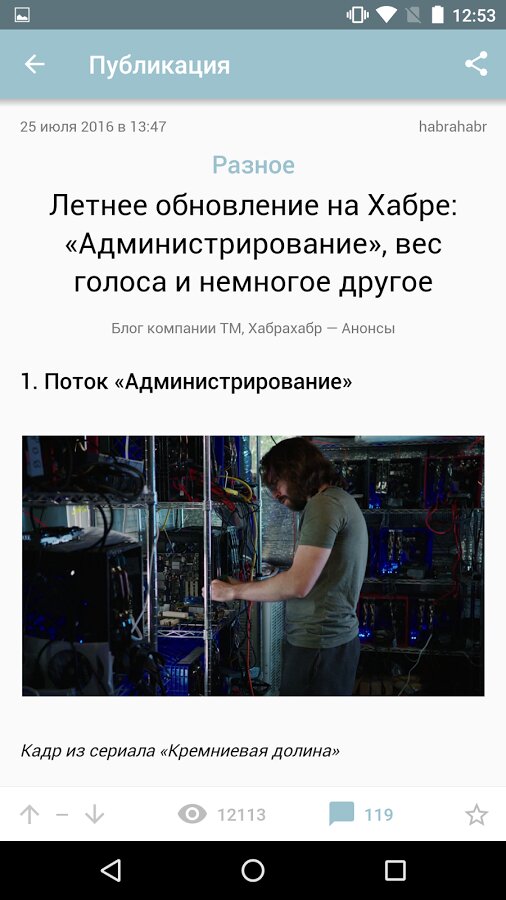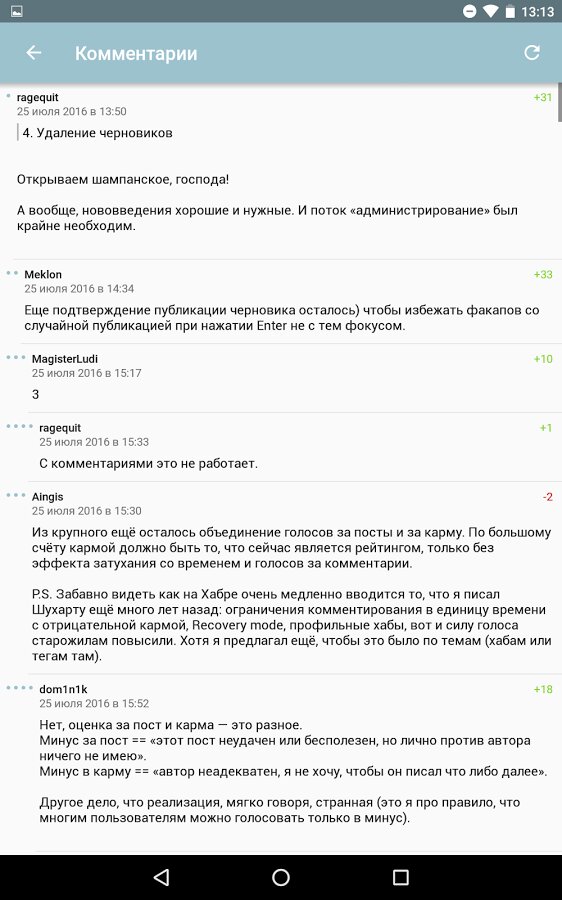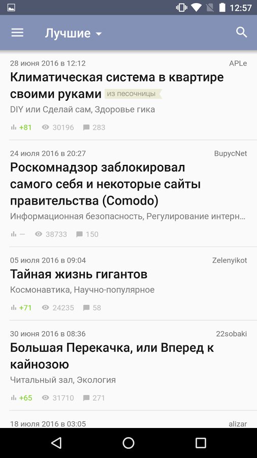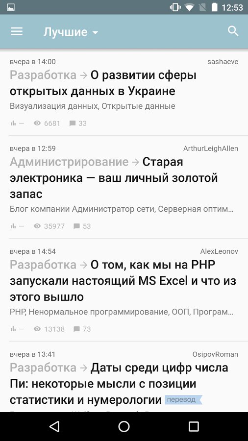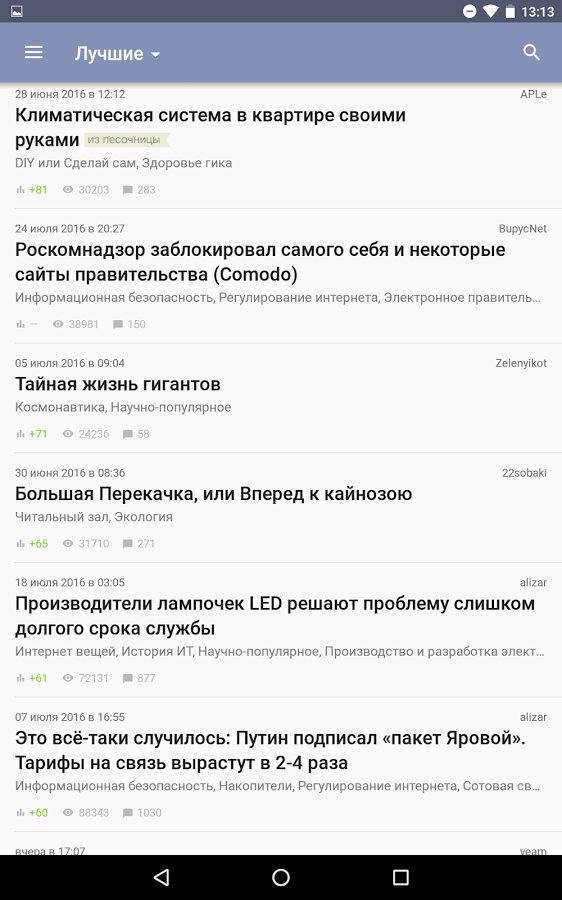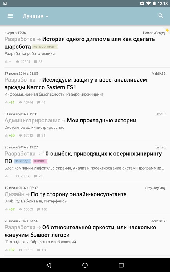 Habr — приложение для комфортного чтения Хабрахабра реализовано для Android устройств. Пользователи смогут просматривать ленту и при необходимости пользоваться фильтрами, читать посты и комментарии, а также участвовать в голосованиях. Хабрахабр позволяет подписываться на хабы, просматривать свой профиль, настраивать цветовые схемы интерфейса. Понравившиеся посты могут быть добавлены в избранные для быстрого доступа.