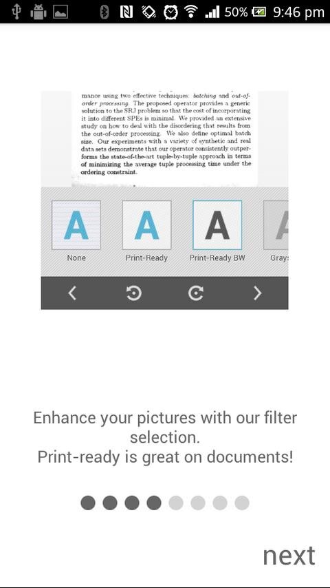 — Вы можете применить необходимые вам фильтры: настроить оттенки серого, усилить цвета или же использовать наш специальный фильтр для документов (иконка в виде звезды), который сделает фон белым, и вы сможете печатать не тратя чернила впустую.