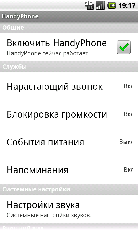 В устройствах Андроид нет такого режима звонка, при котором громкость мелодии постепенно нарастает от тихой до громкой. HandyPhone исправляет этот недостаток.