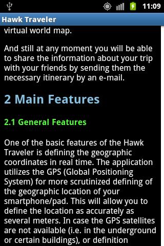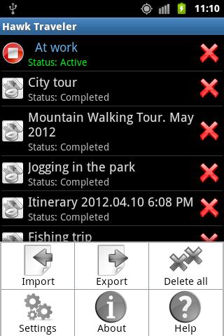 Hawk Traveler позволяет вести историю Ваших перемещений, а также занимается сбором дополнительных данных во время Вашего похода или поездки. Таким образом, Вы сможете сохранять в памяти Вашего телефона неограниченное число маршрутов с подробными данными о каждой из точек маршрута. Вам будут доступны подробные сведения как о маршруте в целом (время начала, окончания, продолжительность, протяженность, средняя и максимальная скорости и т.п.), так и о каждой точке пути в отдельности (время, скорость, направление движения, высота над уровнем моря). Hawk Traveler также позволяет Вам просматривать любой из Ваших маршрутов с помощью встроенной электронной карты мира.