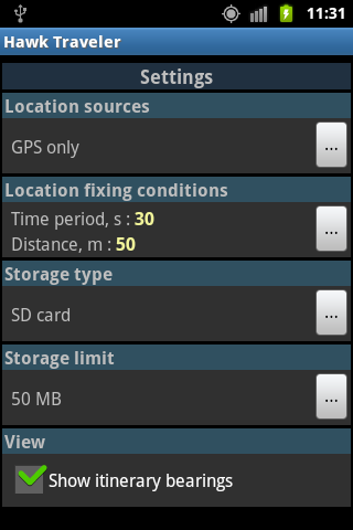 - Дополнительно, Hawk Traveler предлагает ряд настроек, позволяющих изменять способ определения географического местоположения, условия фиксации координат, а также тип и максимальный объем хранилища данных на Вашем устройстве. Это позволит Вам, в случае необходимости, максимально адаптировать работу приложения под Ваши условия использования.