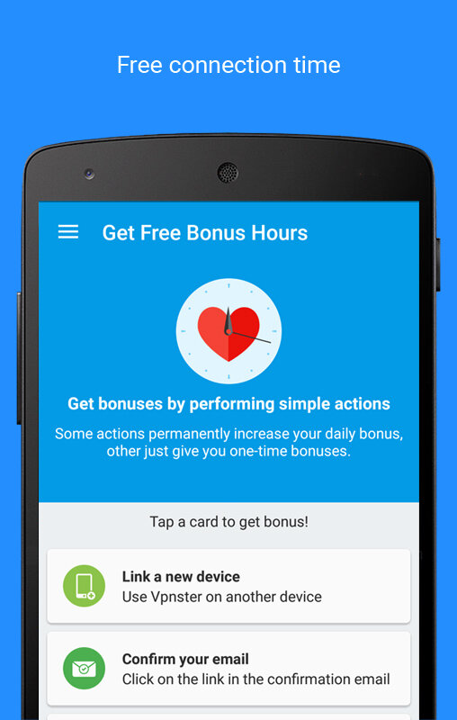 Получайте ежедневные бонусы, просто используя приложение. Тратьте их, чтобы бесплатно подключаться к VPN. Вы можете с легкостью заработать дополнительные бонусы за элементарные действия: поделиться в социальных сетях, оставить отзыв, установить приложение. Проще некуда!
