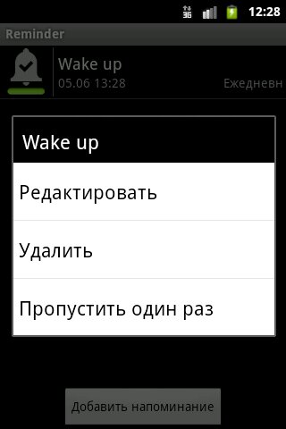 - Пропуск одного повторяющегося напоминания (контекстное меню в списке напоминаний, например если проснулся раньше будильника).