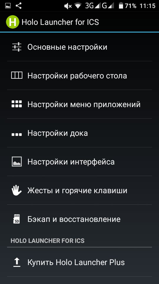 На Андроид 4.0.4 нормально ставится Holo Launcher for Froyo 3.1.2. На этой версии настройки работают. Только бэкапы не подходят от других версий.