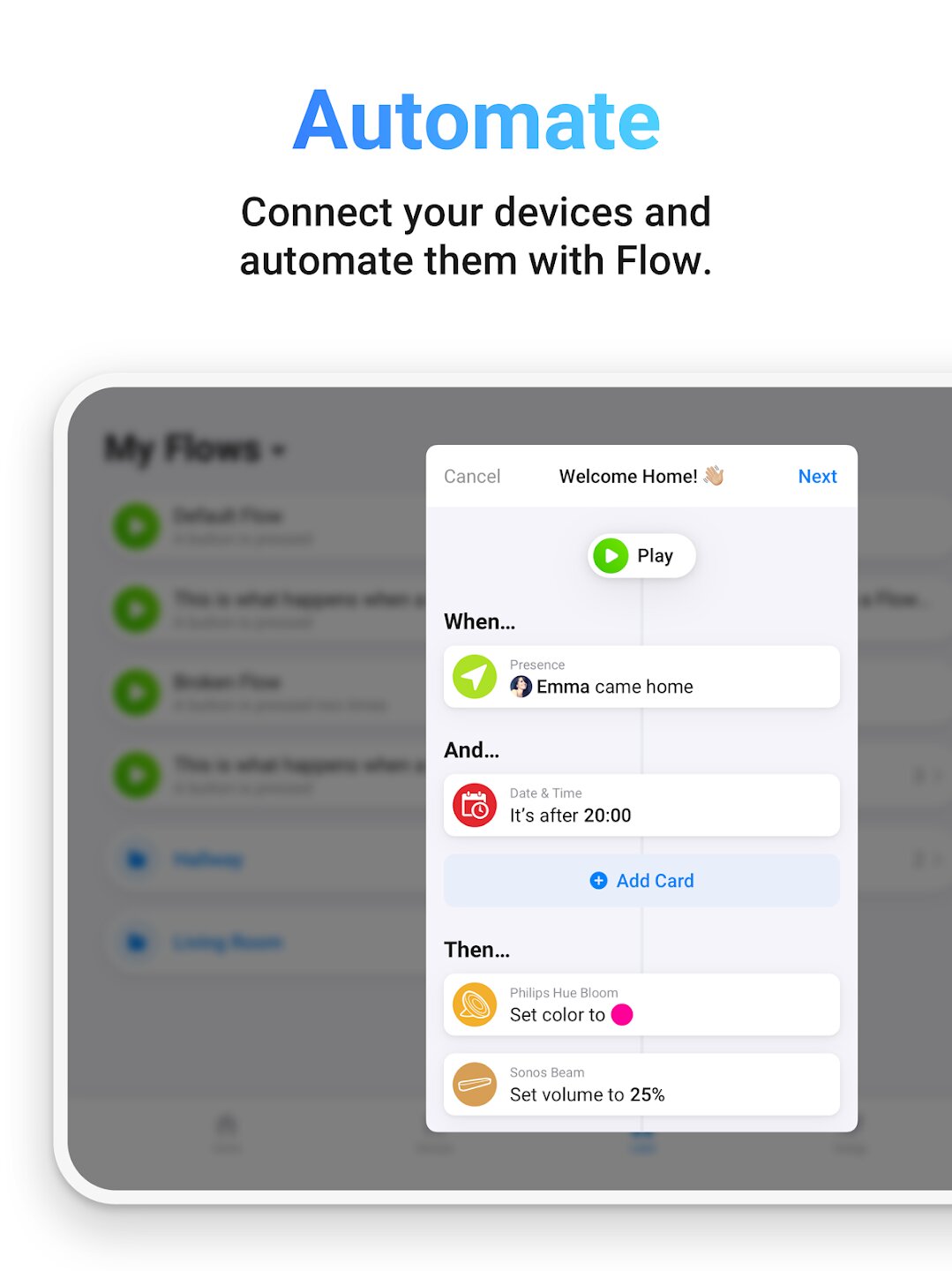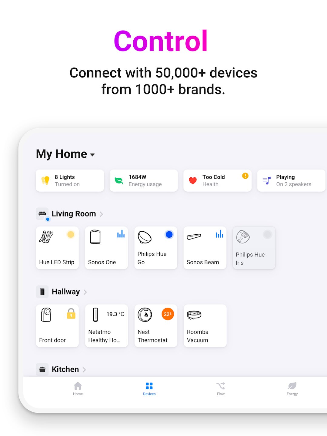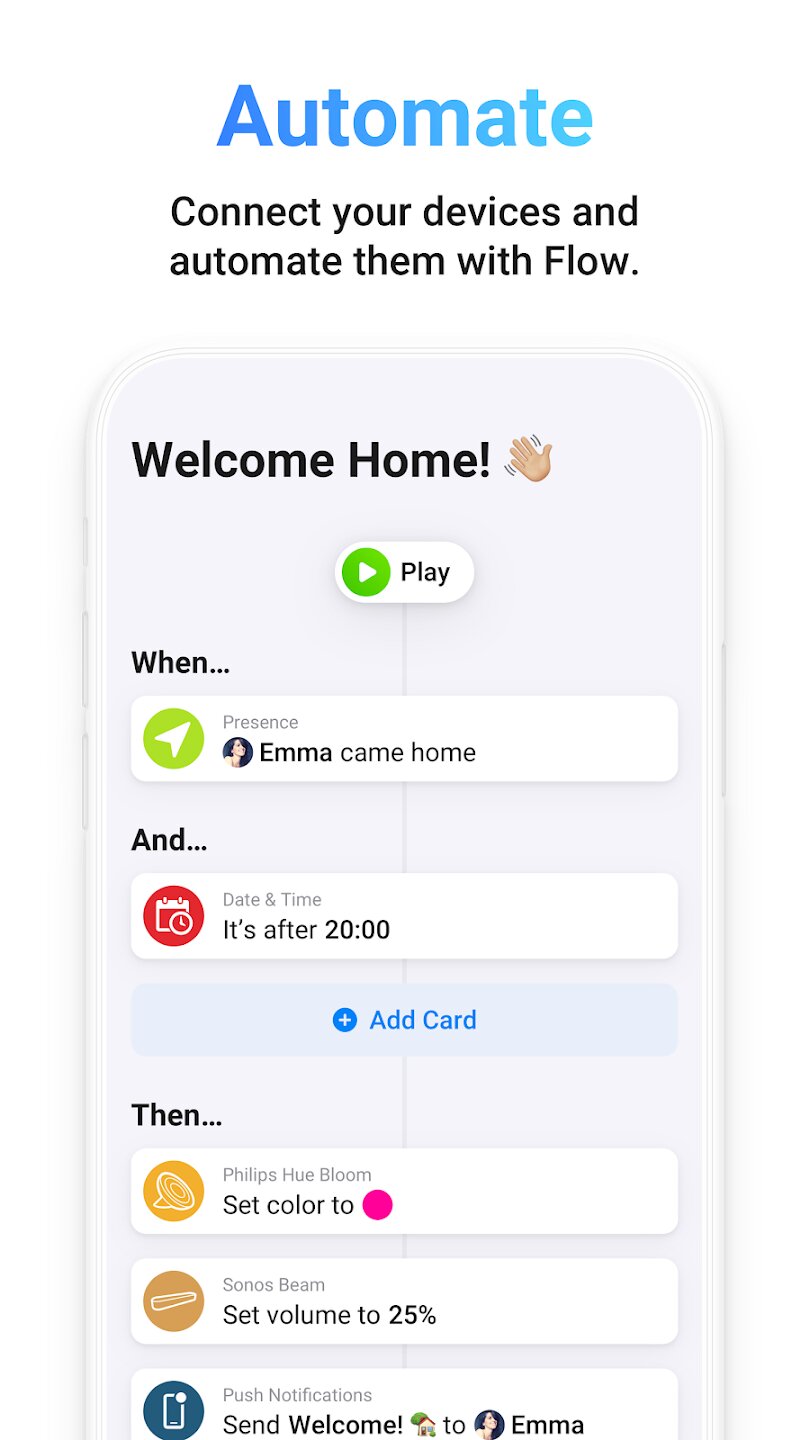 Приложение подключает более 50 000 устройств от более чем 1000 брендов, независимо от того, используют ли они облачные API или локальные протоколы, такие как Zigbee и Z-Wave (с совместимым оборудованием). Его основная сила — интуитивно понятный конструктор автоматизации «Flow», который позволяет создавать пользовательские сценарии, связывая триггеры, условия и действия с помощью простых карт перетаскивания. Помимо автоматизации, Homey обеспечивает мониторинг энергопотребления в режиме реального времени с помощью Homey Energy и предлагает красивые, унифицированные элементы управления для каждого подключенного гаджета. Вы можете удаленно управлять своим домом, использовать виджеты для быстрого доступа и интегрировать приложение с Siri Shortcuts и Apple Watch для удобного управления.