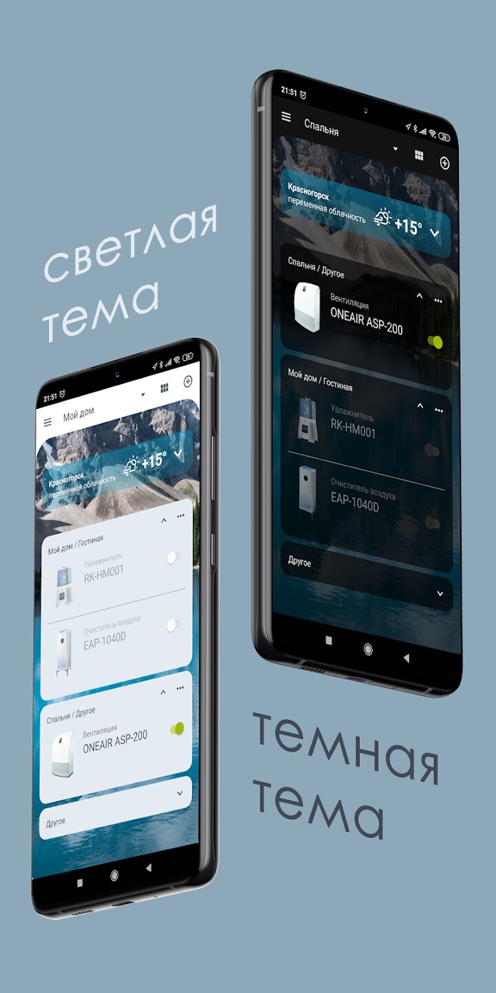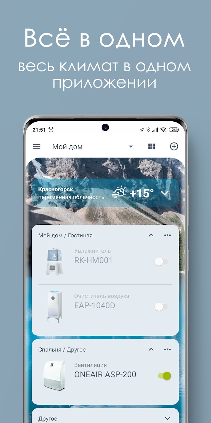 Одно приложение для всех климатических приборов: кондиционеров, водонагревателей, воздухоочистителей, вентиляции, обогревателей, конвекторов, увлажнителей, климатических станций и т.д.