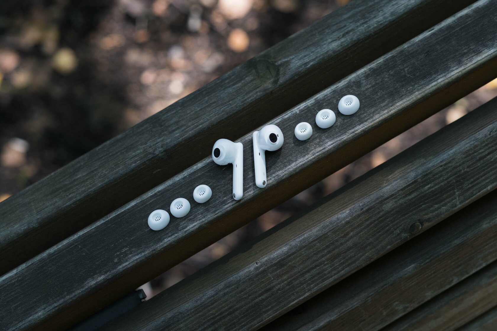 Помимо зарядного кабеля, в комплекте к наушникам прилагаются два типа сменных амбушюров: маленького (S) и большого (L) размера. Все они оснащены специальной сеточкой, защищающей звуковод от попадания пыли или грязи.